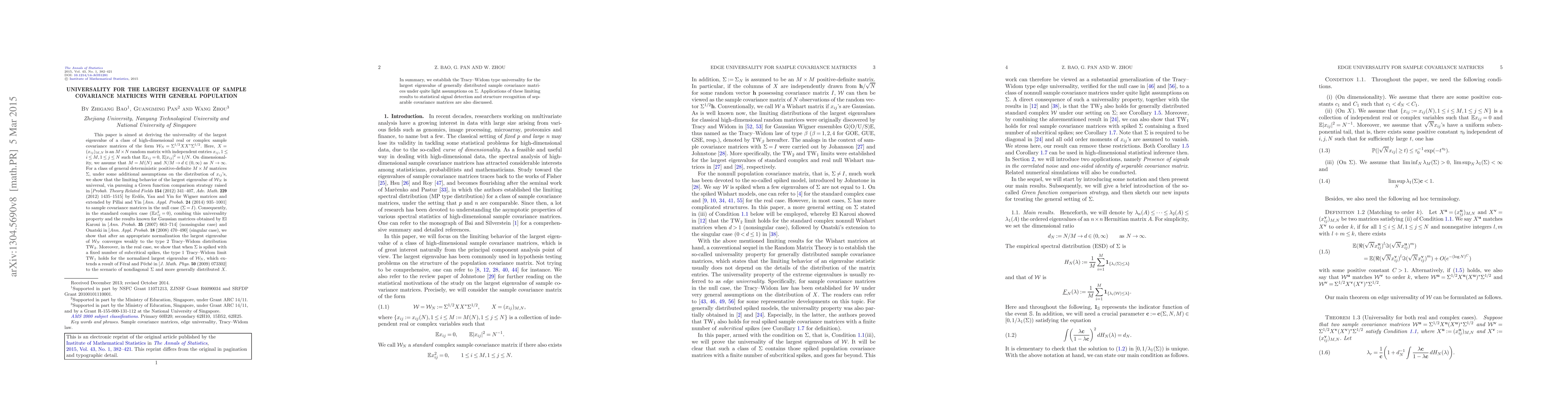 This paper establishes the universality of the largest eigenvalue of high-dimensional sample covariance matrices, showing that under certain conditions, the limiting behavior converges to the Tracy-Widom distribution. Specifically, it extends previous results to general population matrices and demonstrates convergence to type 2 Tracy-Widom for complex cases and type 1 for real cases with specific structures.
