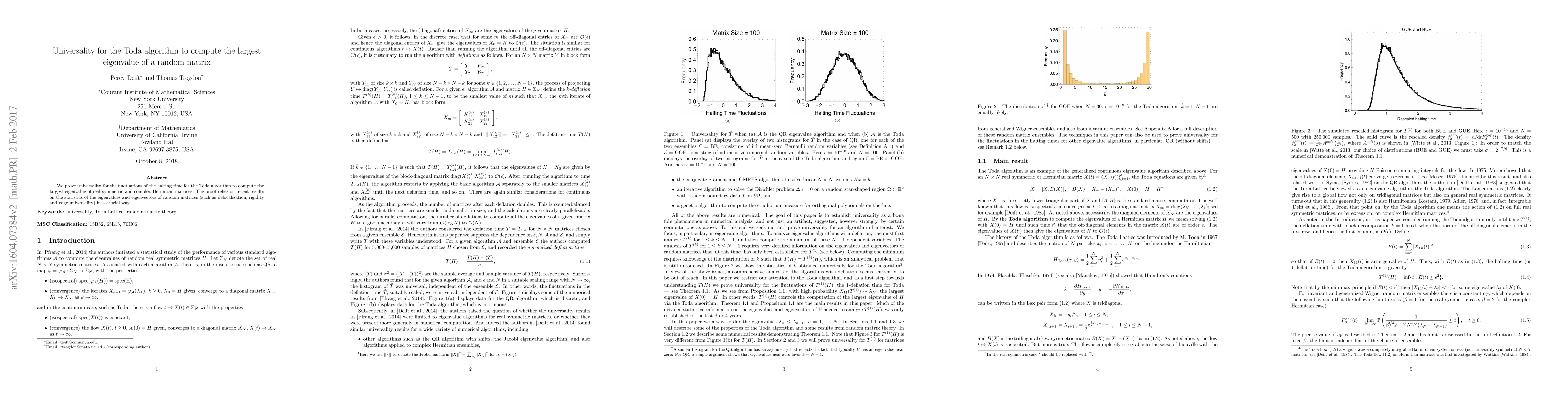 This paper proves universality in the fluctuations of the Toda algorithm's halting time for computing the largest eigenvalue of random symmetric and Hermitian matrices, leveraging recent advances in the statistical properties of random matrix eigenvalues and eigenvectors.