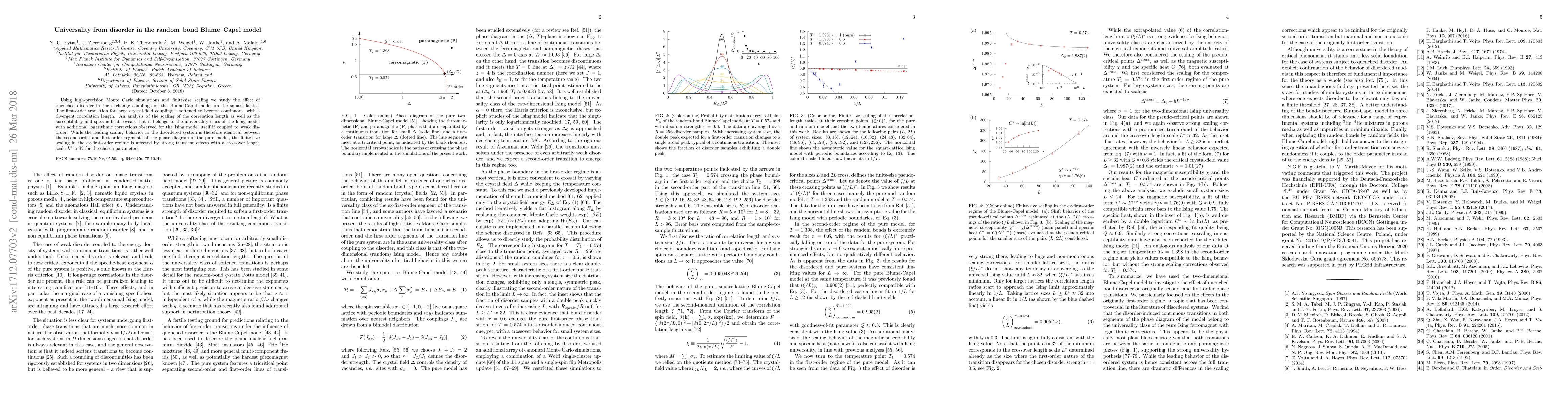 The paper presents a detailed analysis of the Blume-Capel model with random-bond disorder using advanced Monte Carlo simulations and scaling analysis, identifying the universality class of the disordered system as that of the 2D Ising model with logarithmic corrections.