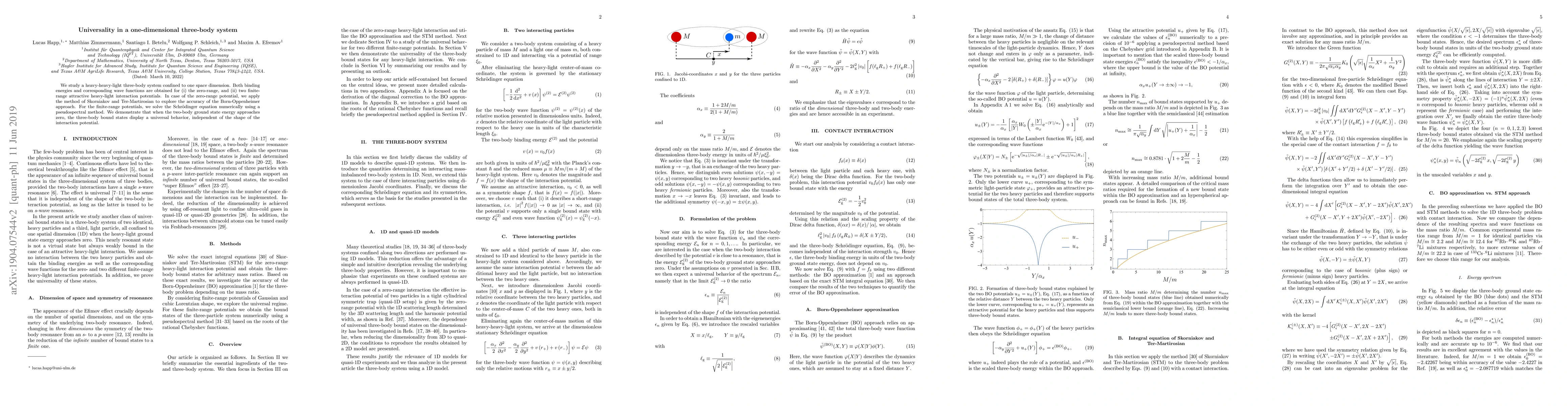 This paper investigates the binding energies and wave functions of a one-dimensional three-body system with heavy-heavy-light configuration, comparing zero-range and finite-range attractive interactions. It finds universal behavior in three-body bound states as the two-body ground state energy nears zero, regardless of the interaction potential's shape.