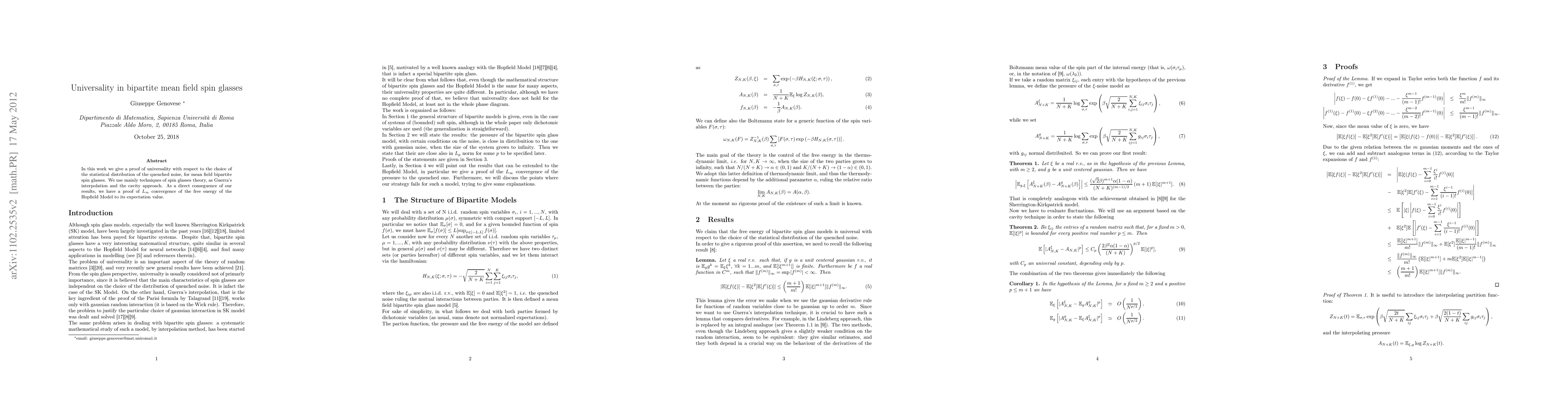 This paper proves universality in mean field bipartite spin glasses regarding the statistical distribution of quenched noise, employing Guerra's interpolation and the cavity method. The study also confirms the convergence of the Hopfield Model's free energy to its expected value.