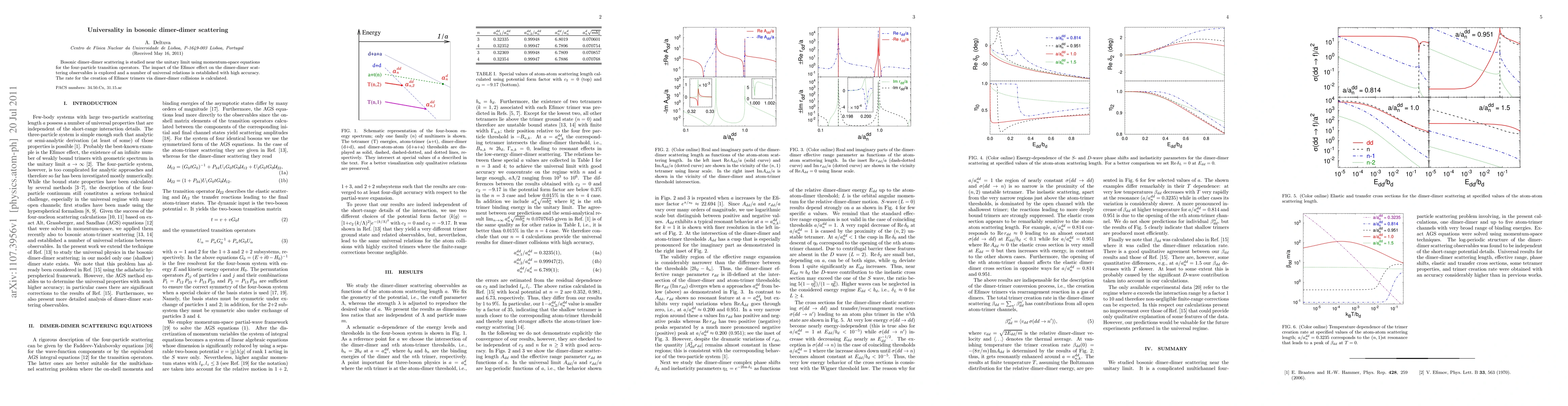 The research employs momentum-space equations for four-particle transition operators to study bosonic dimer-dimer scattering near the unitary limit, using different potential form factors to verify independence from short-range interaction details.