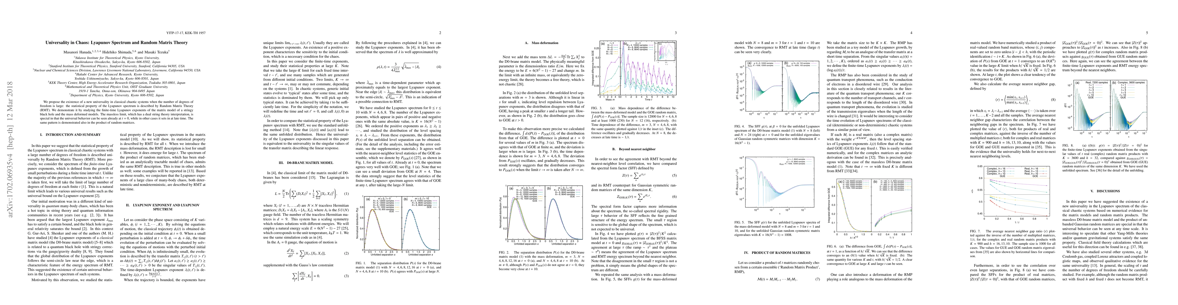 This paper introduces a new universality in chaotic systems where the Lyapunov spectrum's statistical properties align with Random Matrix Theory as the number of degrees of freedom increases. The study confirms this through the analysis of the finite-time Lyapunov exponents in stringy black hole models and their mass-deformed variants.