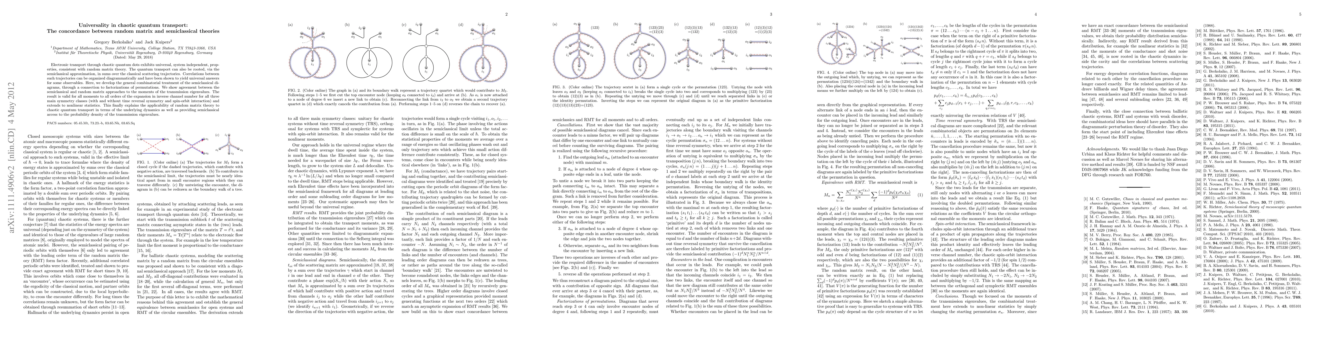 This paper explores the universality in chaotic quantum transport, demonstrating the equivalence between random matrix theory and semiclassical approaches. It establishes a combinatorial treatment of semiclassical diagrams linked to permutation factorizations, showing agreement between both theories for all moments of transmission eigenvalues across various symmetry classes.
