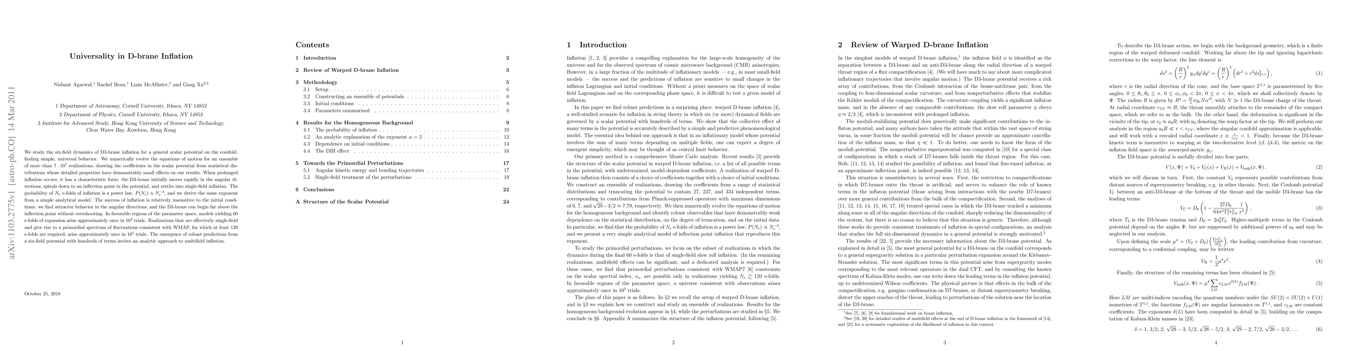 This paper investigates D3-brane inflation dynamics in six-field scenarios, revealing universal behavior across diverse potential configurations. The study finds that prolonged inflation follows a characteristic spiral pattern, with a probability of N_e e-folds following a power law P(N_e) ∝ N_e^-3, consistent with both numerical simulations and analytical models.
