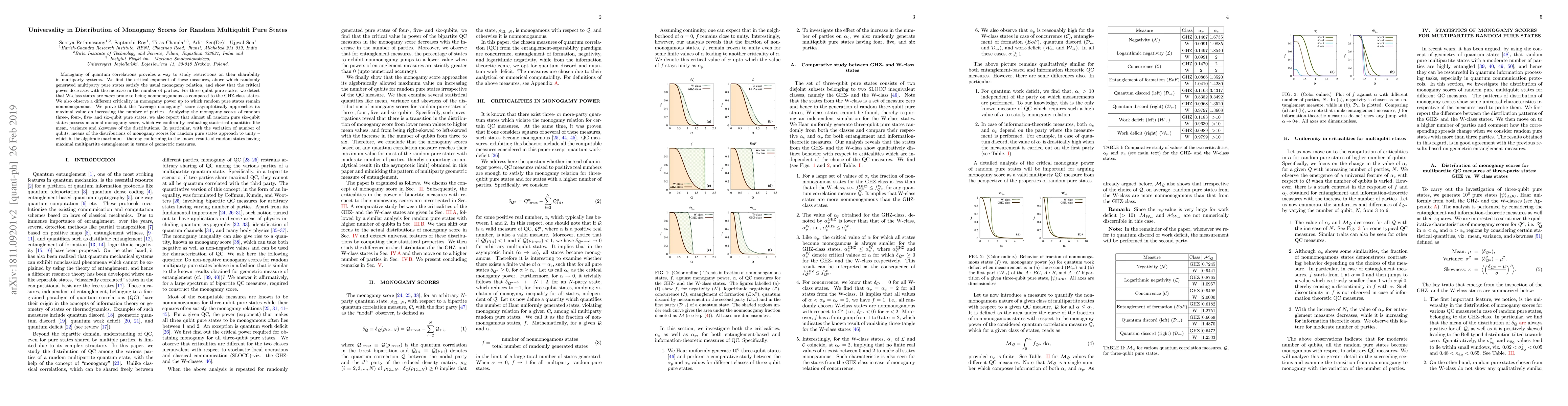 Monogamy of quantum correlations provides a way to study restrictions on their sharability in multiparty systems. We find the critical exponent of these measures, above which randomly generated multiparty pure states satisfy the usual monogamy relation, and show that the critical power decreases with the increase in the number of parties. For three-qubit pure states, we detect that W-class states are more prone to being nonmonogamous as compared to the GHZ-class states. We also observe a different criticality in monogamy power up to which random pure states remain nonmonogamous. We prove that the "average monogamy" score asymptotically approaches its maximal value on increasing the number of parties. Analyzing the monogamy scores of random three-, four-, five- and six-qubit pure states, we also report that almost all random pure six-qubit states possess maximal monogamy score, which we confirm by evaluating statistical quantities like mean, variance and skewness of the distributions. In particular, with the variation of number of qubits, means of the distributions of monogamy scores for random pure states approach to unity -- which is the algebraic maximum -- thereby conforming to the known results of random states having maximal multipartite entanglement in terms of geometric measures.