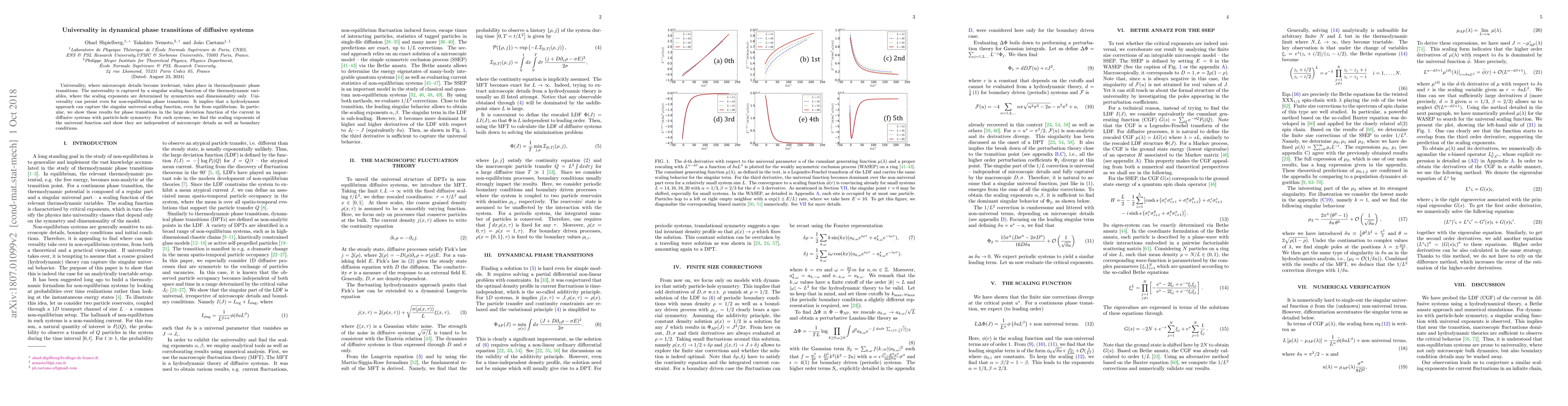 This paper demonstrates that universality, a concept where microscopic details become irrelevant, applies to dynamical phase transitions in diffusive systems, showing that hydrodynamic approaches can capture the singular scaling function far from equilibrium. The study reveals that the scaling exponents in the large deviation function of current in these systems are independent of microscopic details and boundary conditions.