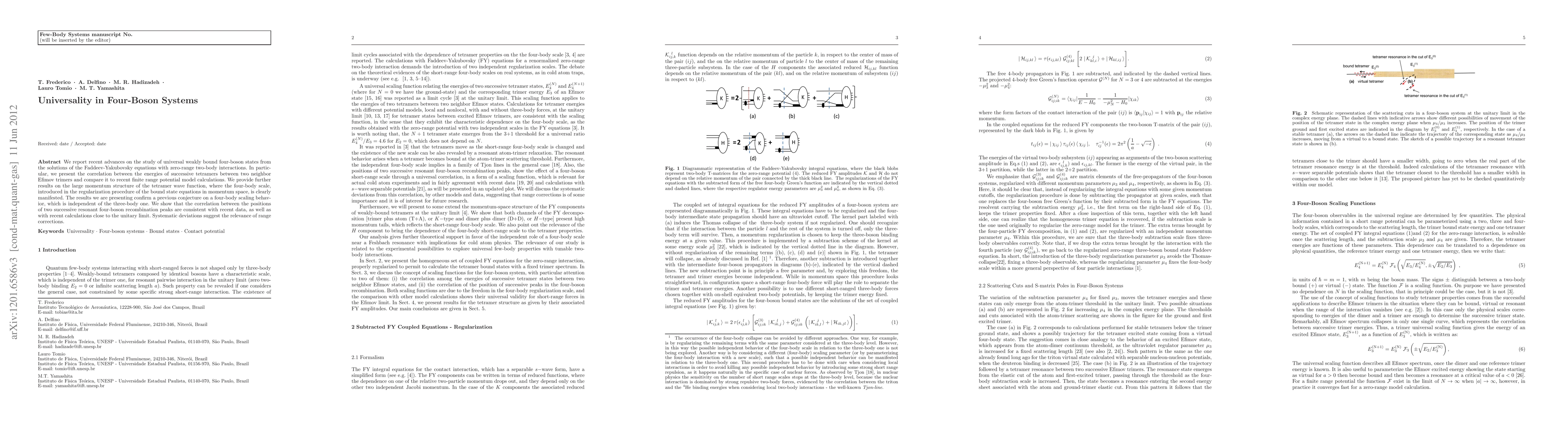We report recent advances on the study of universal weakly bound four-boson states from the solutions of the Faddeev-Yakubovsky equations with zero-range two-body interactions. In particular, we present the correlation between the energies of successive tetramers between two neighbor Efimov trimers and compare it to recent finite range potential model calculations. We provide further results on the large momentum structure of the tetramer wave function, where the four-body scale, introduced in the regularization procedure of the bound state equations in momentum space, is clearly manifested. The results we are presenting confirm a previous conjecture on a four-body scaling behavior, which is independent of the three-body one. We show that the correlation between the positions of two successive resonant four-boson recombination peaks are consistent with recent data, as well as with recent calculations close to the unitary limit. Systematic deviations suggest the relevance of range corrections.