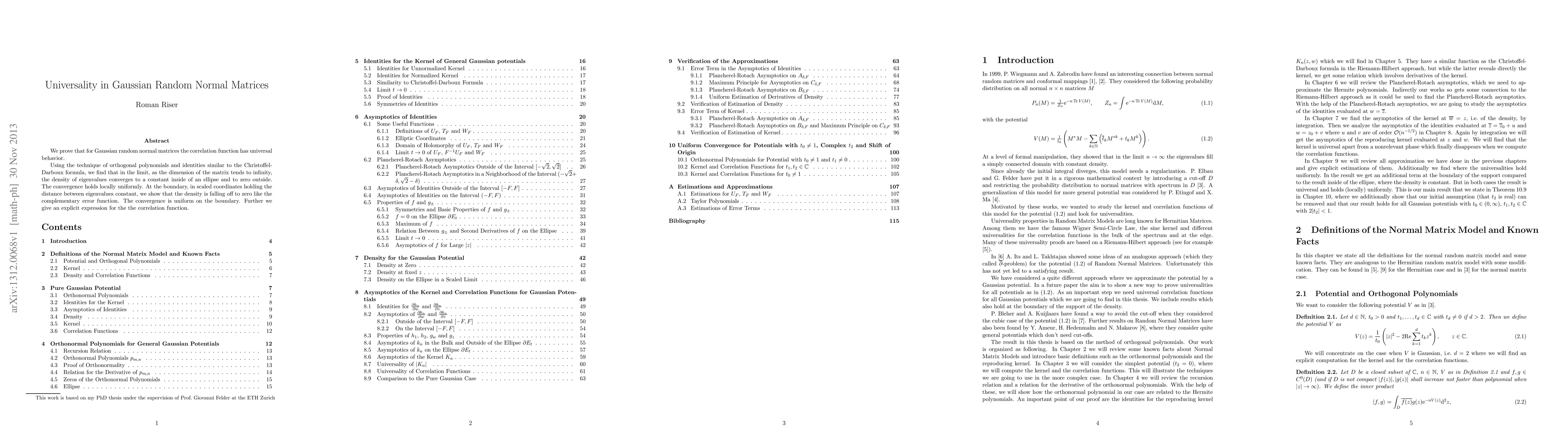 This paper demonstrates that Gaussian random normal matrices exhibit universal behavior in their correlation functions. As the matrix dimension grows, the eigenvalue density converges uniformly to a constant within an elliptical region and decays as a complementary error function at the boundary.