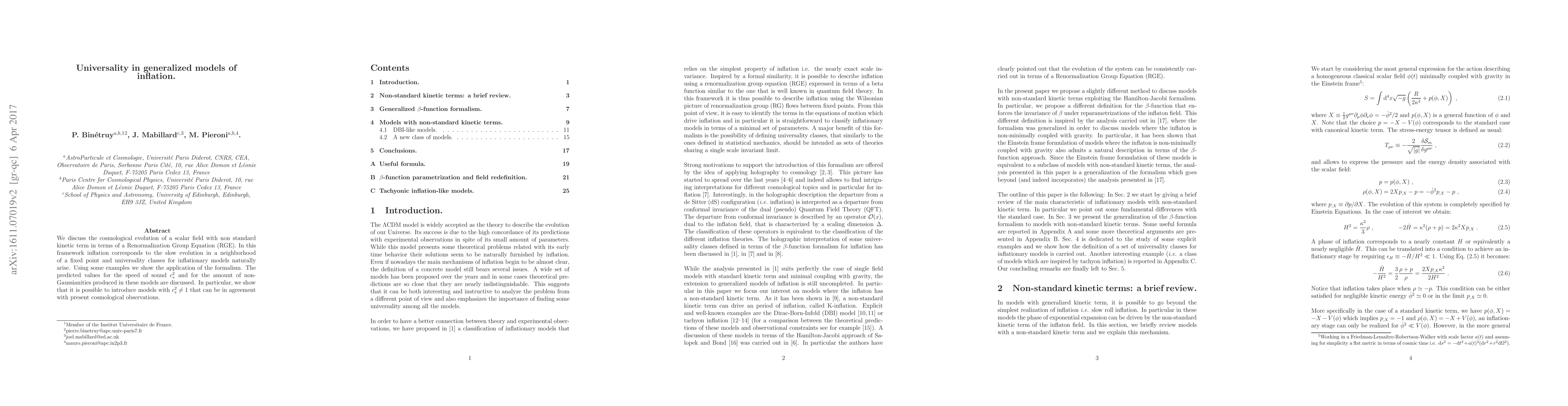 We discuss the cosmological evolution of a scalar field with non standard kinetic term in terms of a Renormalization Group Equation (RGE). In this framework inflation corresponds to the slow evolution in a neighborhood of a fixed point and universality classes for inflationary models naturally arise. Using some examples we show the application of the formalism. The predicted values for the speed of sound $c_s$ and for the amount of non-Gaussianities produced in these models are discussed. In particular, we show that it is possible to introduce models with $c_s^2 \neq 1$ that can be in agreement with present cosmological observations.