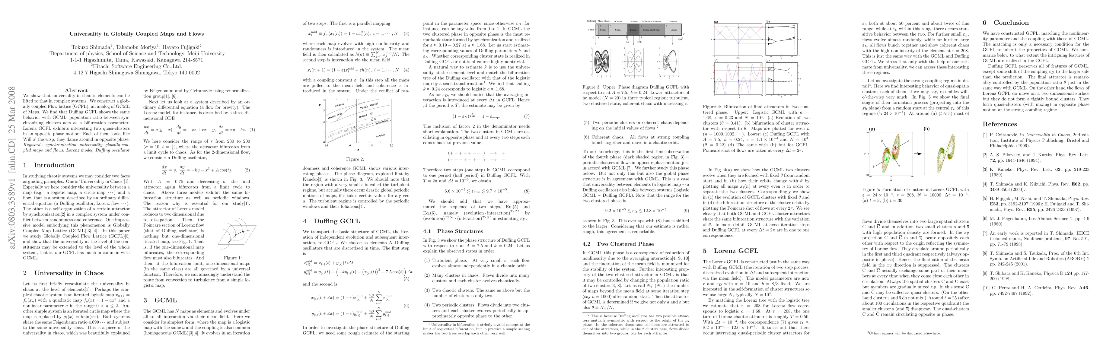 Summary: This paper demonstrates universality in chaotic behavior across complex systems using a globally coupled Flow lattice (GCFL) analogous to a globally coupled Map lattice (GCML). The Duffing GCFL mirrors GCML behavior, while the Lorenz GCFL reveals intriguing quasi-clusters in opposite phase motion resembling Will o' the wisps.