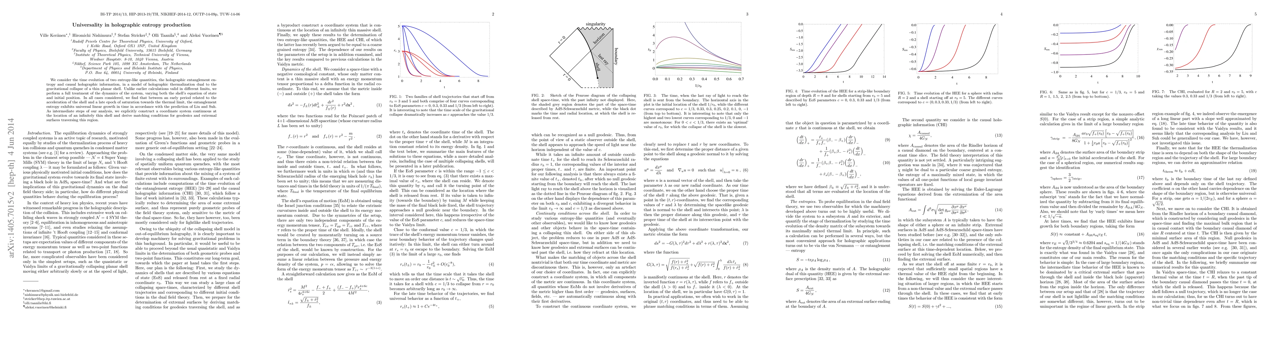 We consider the time evolution of two entropy-like quantities, the holographic entanglement entropy and causal holographic information, in a model of holographic thermalization dual to the gravitational collapse of a thin planar shell. Unlike earlier calculations valid in different limits, we perform a full treatment of the dynamics of the system, varying both the shell's equation of state and initial position. In all cases considered, we find that between an early period related to the acceleration of the shell and a late epoch of saturation towards the thermal limit, the entanglement entropy exhibits universal linear growth in time in accordance with the prediction of Liu and Suh. As intermediate steps of our analysis, we explicitly construct a coordinate system continuous at the location of an infinitely thin shell and derive matching conditions for geodesics and extremal surfaces traversing this region.