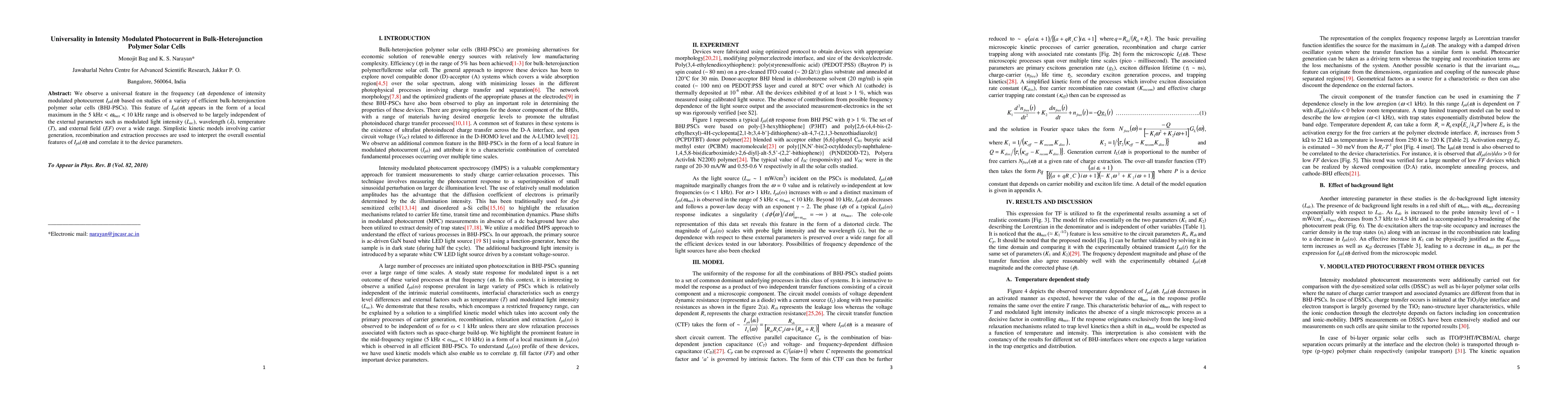 This study reveals a universal frequency-dependent peak in the intensity modulated photocurrent (Iph) in bulk-heterojunction polymer solar cells across various devices, occurring in the 5 kHz to 10 kHz range and largely unaffected by external parameters. Kinetic models help interpret these findings and relate them to device characteristics.