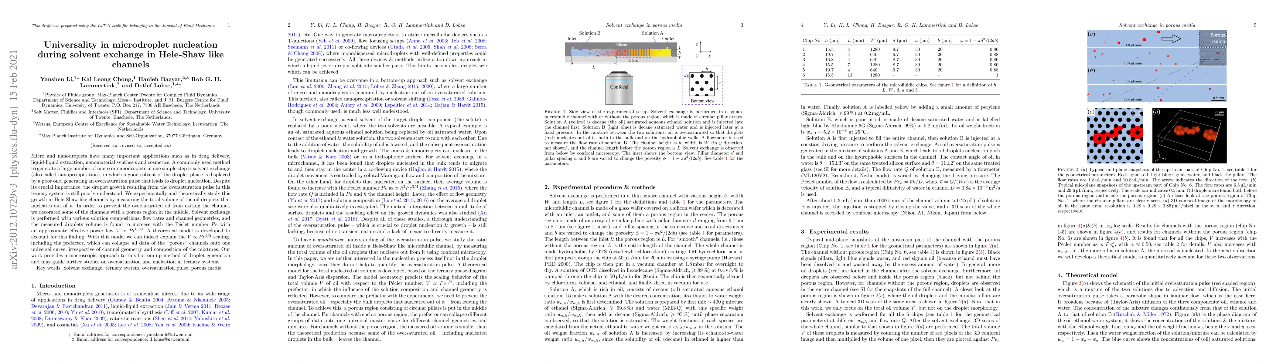 This paper investigates the nucleation of microdroplets during solvent exchange in Hele-Shaw like channels, revealing a universal scaling law $V\propto Pe^{0.50}$ for droplet volume with the P\'eclet number. A theoretical model explains this scaling and collapses diverse experimental data into a universal curve, offering insights into the macroscopic behavior of droplet generation in ternary systems.