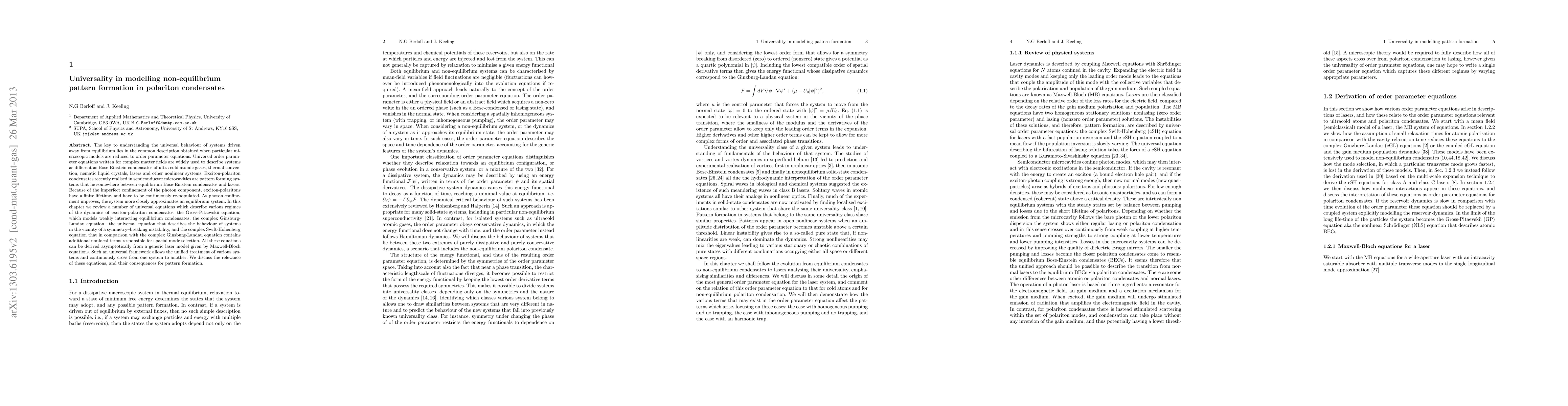 This paper reviews universal equations describing non-equilibrium pattern formation in exciton-polariton condensates, bridging systems like Bose-Einstein condensates and lasers. It highlights the Gross-Pitaevskii, Ginsburg-Landau, and Swift-Hohenberg equations, derived from Maxwell-Bloch equations, to model different dynamic regimes and their implications for pattern formation.