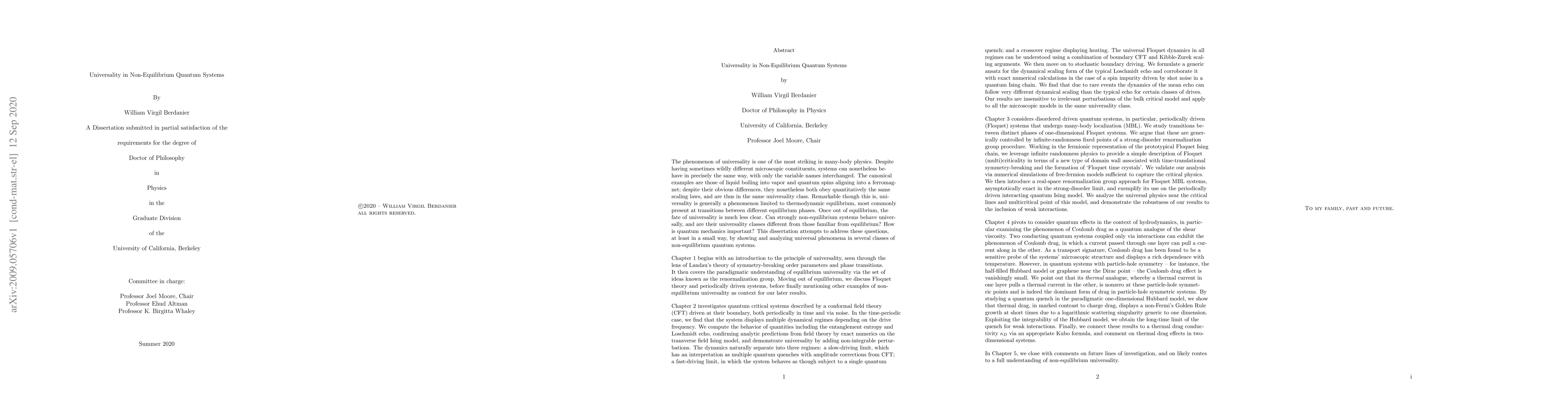 The phenomenon of universality is one of the most striking in many-body physics. Despite having sometimes wildly different microscopic constituents, systems can nonetheless behave in precisely the same way, with only the variable names interchanged. The canonical examples are those of liquid boiling into vapor and quantum spins aligning into a ferromagnet; despite their obvious differences, they nonetheless both obey quantitatively the same scaling laws, and are thus in the same universality class. Remarkable though this is, universality is generally a phenomenon limited to thermodynamic equilibrium, most commonly present at transitions between different equilibrium phases. Once out of equilibrium, the fate of universality is much less clear. Can strongly non-equilibrium systems behave universally, and are their universality classes different from those familiar from equilibrium? How is quantum mechanics important? This dissertation attempts to address these questions, at least in a small way, by showing and analyzing universal phenomena in several classes of non-equilibrium quantum systems.