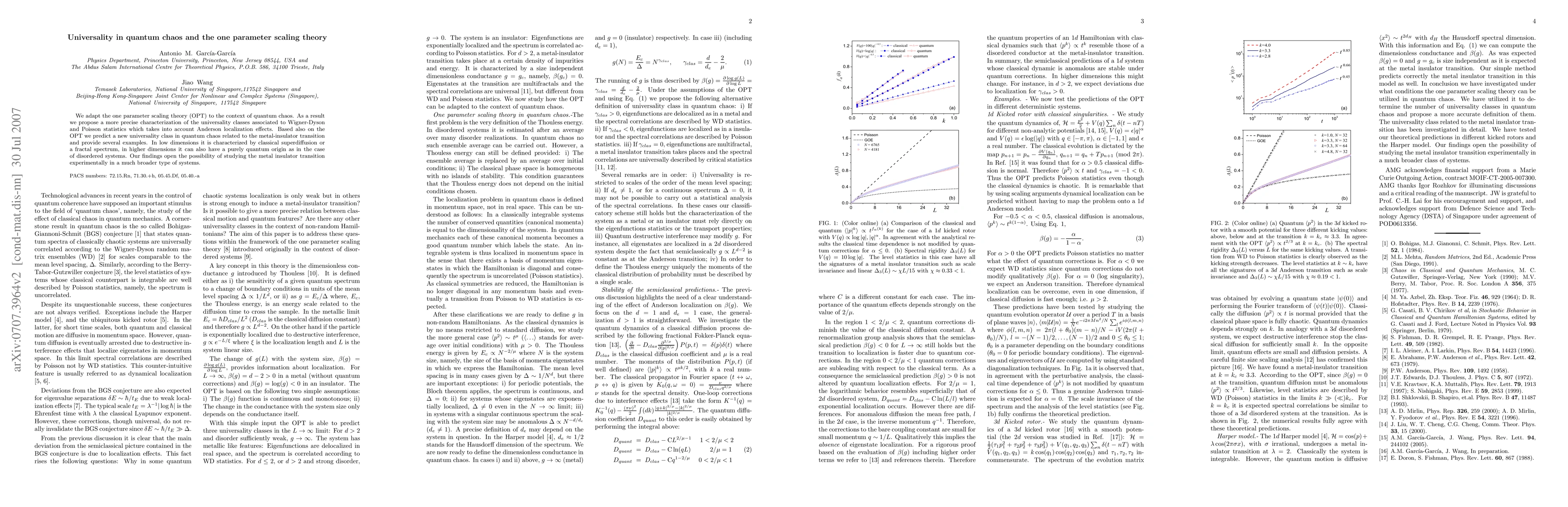 This paper adapts the one parameter scaling theory to quantum chaos, proposing a refined classification of universality classes linked to Wigner-Dyson and Poisson statistics, including Anderson localization effects. It also predicts a new universality class related to the metal-insulator transition, characterized by classical superdiffusion or a fractal spectrum in low dimensions and quantum origins in higher dimensions.