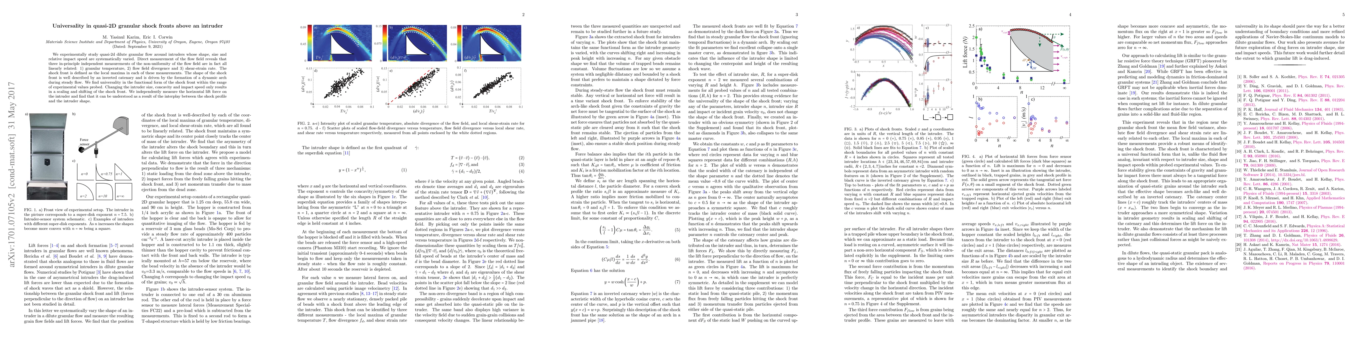 We experimentally study quasi-2d dilute granular flow around intruders whose shape, size and relative impact speed are systematically varied. Direct measurement of the flow field reveals that three in-principle independent measurements of the non-uniformity of the flow field are in fact all linearly related: 1) granular temperature, 2) flow field divergence and 3) shear-strain rate. The shock front is defined as the local maxima in each of these measurements. The shape of the shock front is well described by an inverted catenary and is driven by the formation of a dynamic arch during steady flow. We find universality in the functional form of the shock front within the range of experimental values probed. Changing the intruder size, concavity and impact speed only results in a scaling and shifting of the shock front. We independently measure the horizontal lift force on the intruder and find that it can be understood as a result of the interplay between the shock profile and the intruder shape.
