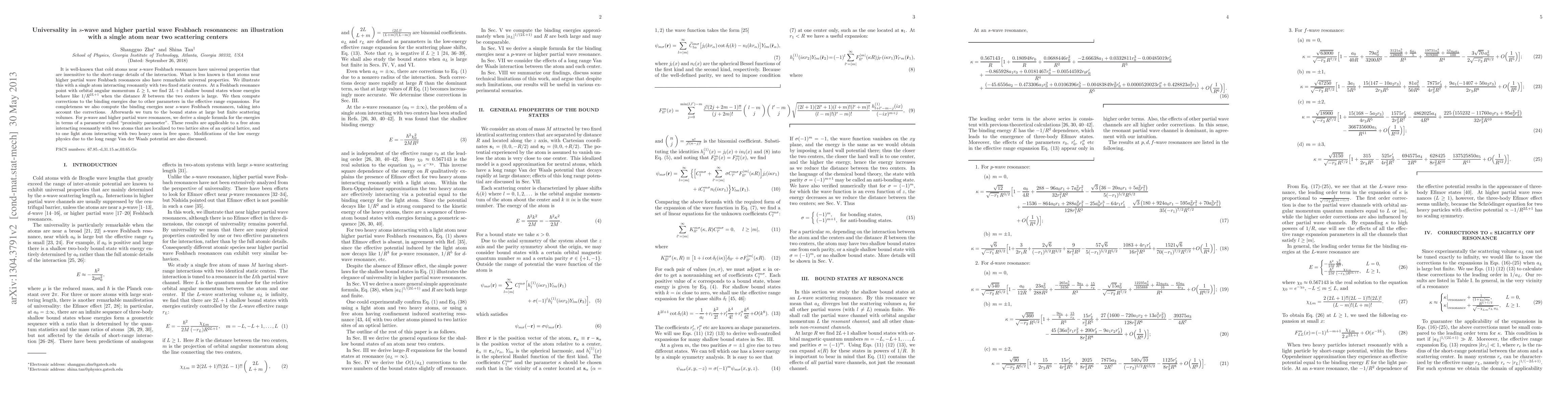 It is well-known that cold atoms near s-wave Feshbach resonances have universal properties that are insensitive to the short-range details of the interaction. What is less known is that atoms near higher partial wave Feshbach resonances also have remarkable universal properties. We illustrate this with a single atom interacting resonantly with two fixed static centers. At a Feshbach resonance point with orbital angular momentum $L\ge1$, we find $2L+1$ shallow bound states whose energies behave like $1/R^{2L+1}$ when the distance $R$ between the two centers is large. We then compute corrections to the binding energies due to other parameters in the effective range expansions. For completeness we also compute the binding energies near s-wave Feshbach resonances, taking into account the corrections. Afterwards we turn to the bound states at large but finite scattering volumes. For p-wave and higher partial wave resonances, we derive a simple formula for the energies in terms of a parameter called "proximity parameter". These results are applicable to a free atom interacting resonantly with two atoms that are localized to two lattice sites of an optical lattice, and to one light atom interacting with two heavy ones in free space. Modifications of the low energy physics due to the long range Van der Waals potential are also discussed.