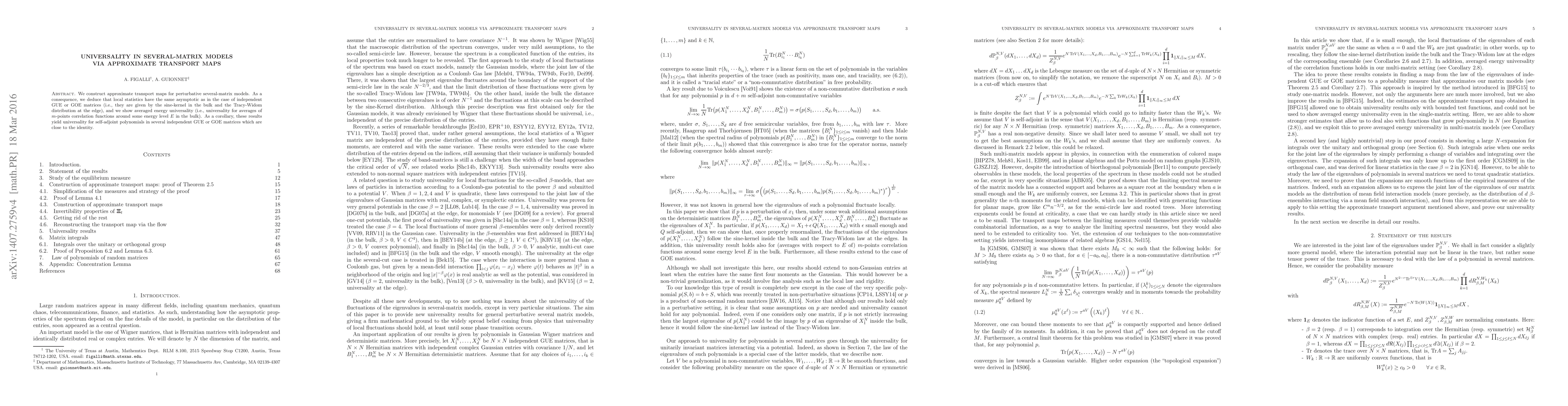 The paper introduces a novel approach using approximate transport maps to prove universality in several-matrix models, extending previous work on independent GUE or GOE matrices.