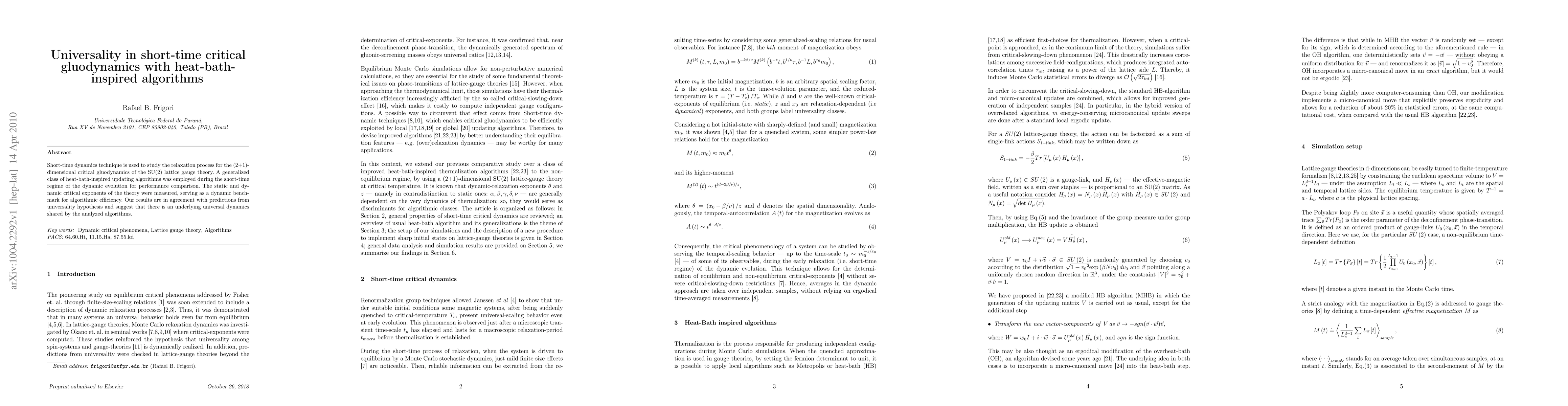 Short-time dynamics technique is used to study the relaxation process for the (2+1)-dimensional critical gluodynamics of the SU(2) lattice gauge theory. A generalized class of heat-bath-inspired updating algorithms was employed during the short-time regime of the dynamic evolution for performance comparison. The static and dynamic critical exponents of the theory were measured, serving as a dynamic benchmark for algorithmic efficiency. Our results are in agreement with predictions from universality hypothesis and suggest that there is an underlying universal dynamics shared by the analyzed algorithms.