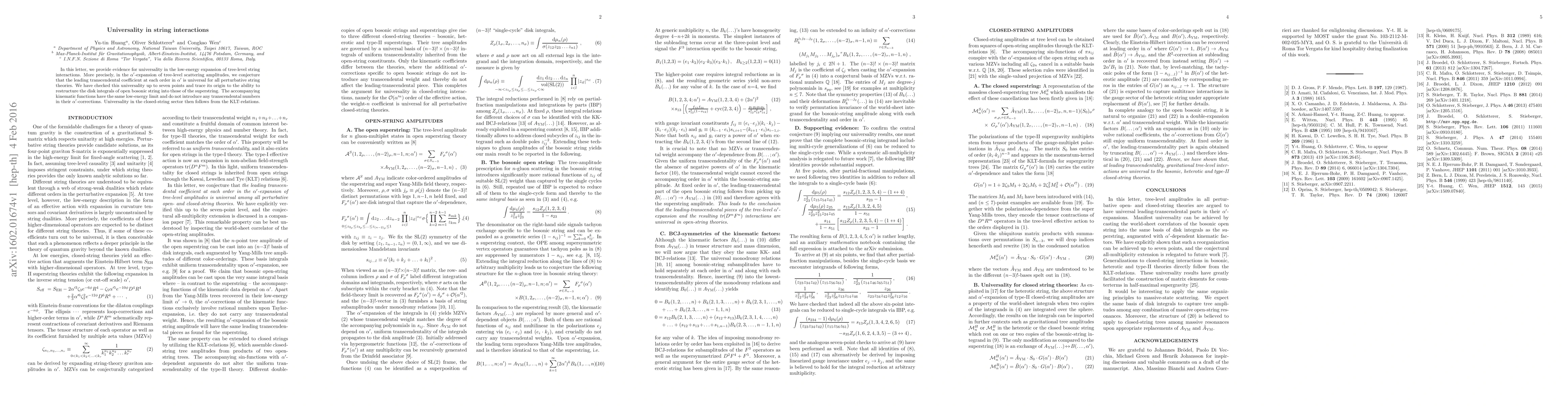 In this letter, we provide evidence for universality in the low-energy expansion of tree-level string interactions. More precisely, in the alpha'-expansion of tree-level scattering amplitudes, we conjecture that the leading transcendental coefficient at each order in alpha' is universal for all perturbative string theories. We have checked this universality up to seven points and trace its origin to the ability to restructure the disk integrals of open bosonic string into those of the superstring. The accompanying kinematic functions have the same low-energy limit and do not introduce any transcendental numbers in their alpha'-corrections. Universality in the closed-string sector then follows from the KLT-relations.