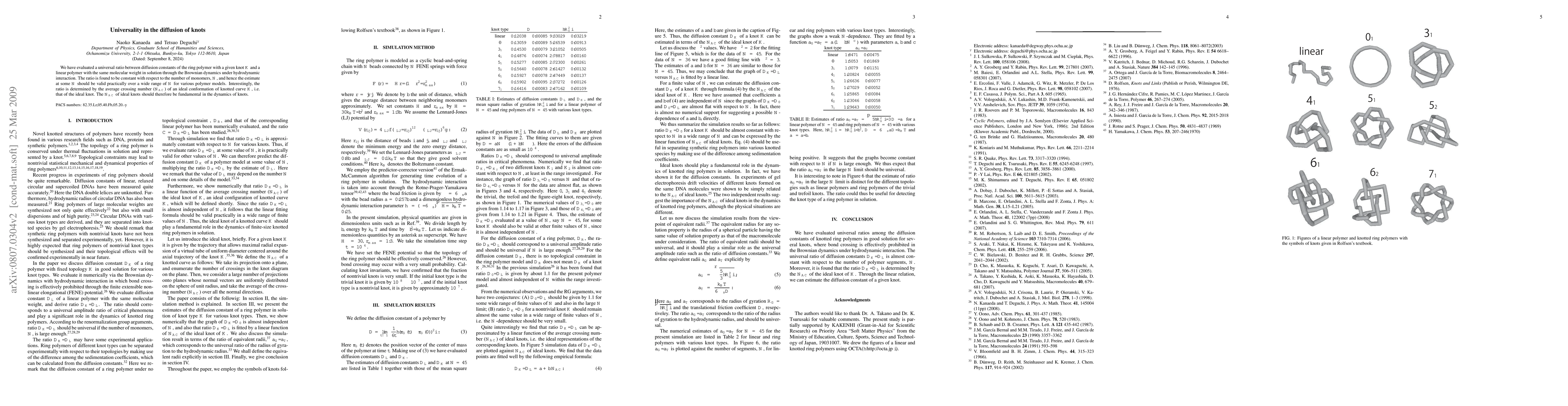 We have evaluated a universal ratio between diffusion constants of the ring polymer with a given knot $K$ and a linear polymer with the same molecular weight in solution through the Brownian dynamics under hydrodynamic interaction. The ratio is found to be constant with respect to the number of monomers, $N$, and hence the estimate at some $N$ should be valid practically over a wide range of $N$ for various polymer models. Interestingly, the ratio is determined by the average crossing number ($N_{AC}$) of an ideal conformation of knotted curve $K$, i.e. that of the ideal knot. The $N_{AC}$ of ideal knots should therefore be fundamental in the dynamics of knots.