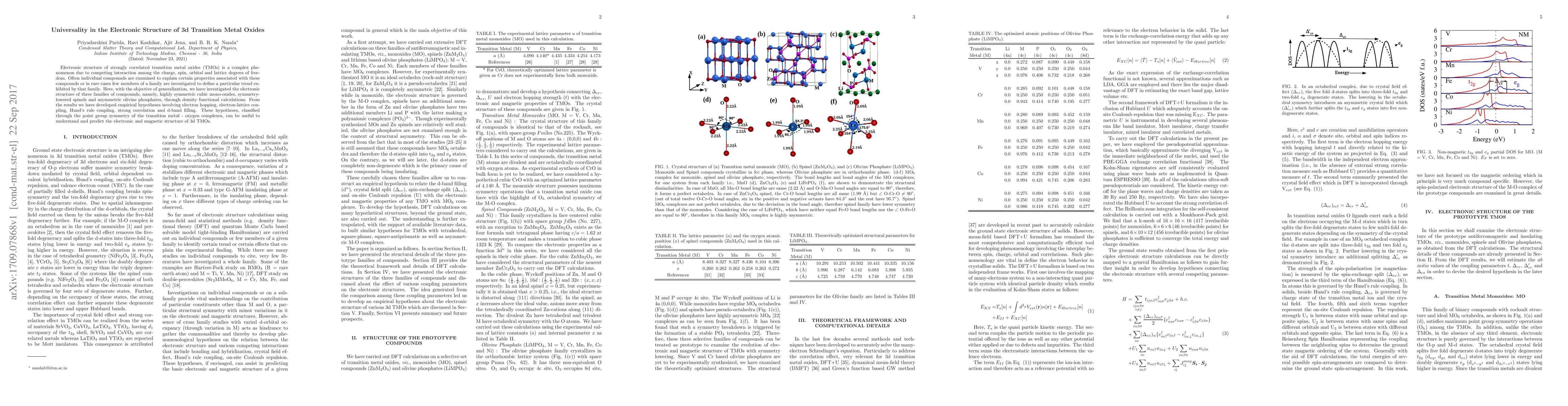 Electronic structure of strongly correlated transition metal oxides (TMOs) is a complex phenomenon due to competing interaction among the charge, spin, orbital and lattice degrees of freedom. Often individual compounds are examined to explain certain properties associated with these compounds or in rare cases few members of a family are investigated to define a particular trend exhibited by that family. Here, with the objective of generalization, we have investigated the electronic structure of three families of compounds, namely, highly symmetric cubic mono-oxides, symmetry-lowered spinels and asymmetric olivine phosphates, through density functional calculations. From the results we have developed empirical hypotheses involving electron hopping, electron-lattice coupling, Hund's rule coupling, strong correlation and d-band filling. These hypotheses, classified through the point group symmetry of the transition metal - oxygen complexes, can be useful to understand and predict the electronic and magnetic structure of 3d TMOs.