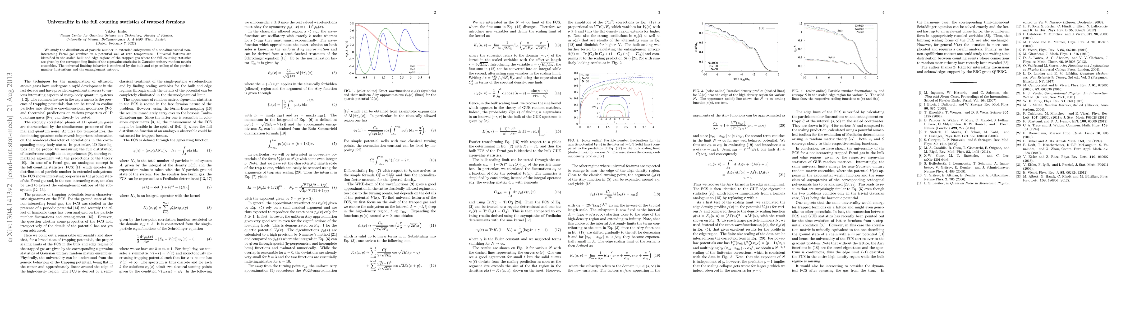 This paper explores the full counting statistics of particle number in extended subsystems of a one-dimensional non-interacting Fermi gas, identifying universal features in both bulk and edge regions that align with Gaussian unitary random matrix ensembles. The study confirms these universal behaviors through the scaling of particle number fluctuations and entanglement entropy.