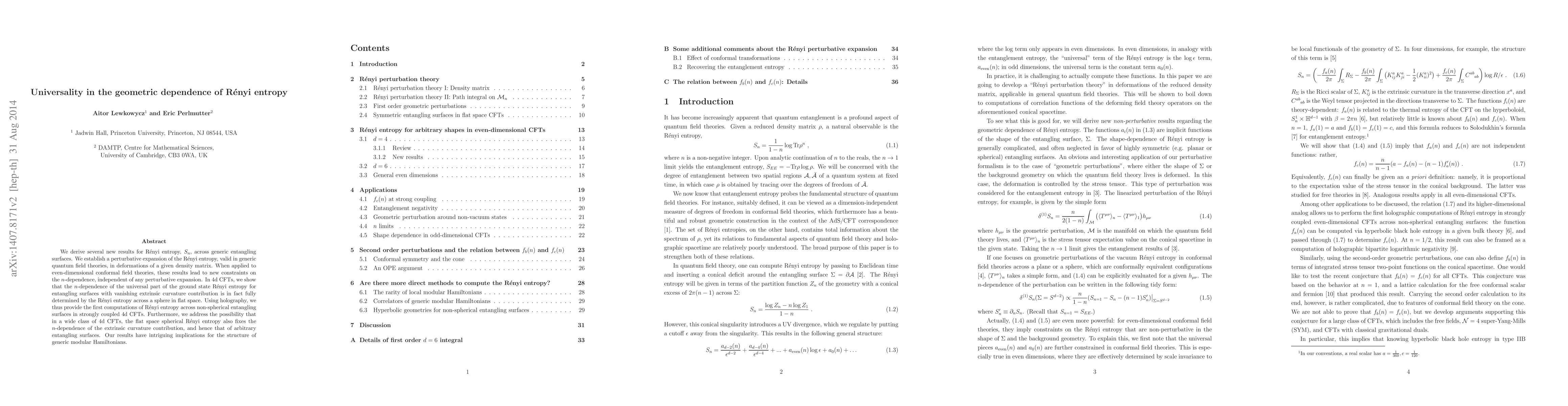 We derive several new results for Renyi entropy, $S_n$, across generic entangling surfaces. We establish a perturbative expansion of the Renyi entropy, valid in generic quantum field theories, in deformations of a given density matrix. When applied to even-dimensional conformal field theories, these results lead to new constraints on the $n$-dependence, independent of any perturbative expansion. In 4d CFTs, we show that the $n$-dependence of the universal part of the ground state Renyi entropy for entangling surfaces with vanishing extrinsic curvature contribution is in fact fully determined by the Renyi entropy across a sphere in flat space. Using holography, we thus provide the first computations of Renyi entropy across non-spherical entangling surfaces in strongly coupled 4d CFTs. Furthermore, we address the possibility that in a wide class of 4d CFTs, the flat space spherical Renyi entropy also fixes the $n$-dependence of the extrinsic curvature contribution, and hence that of arbitrary entangling surfaces. Our results have intriguing implications for the structure of generic modular Hamiltonians.