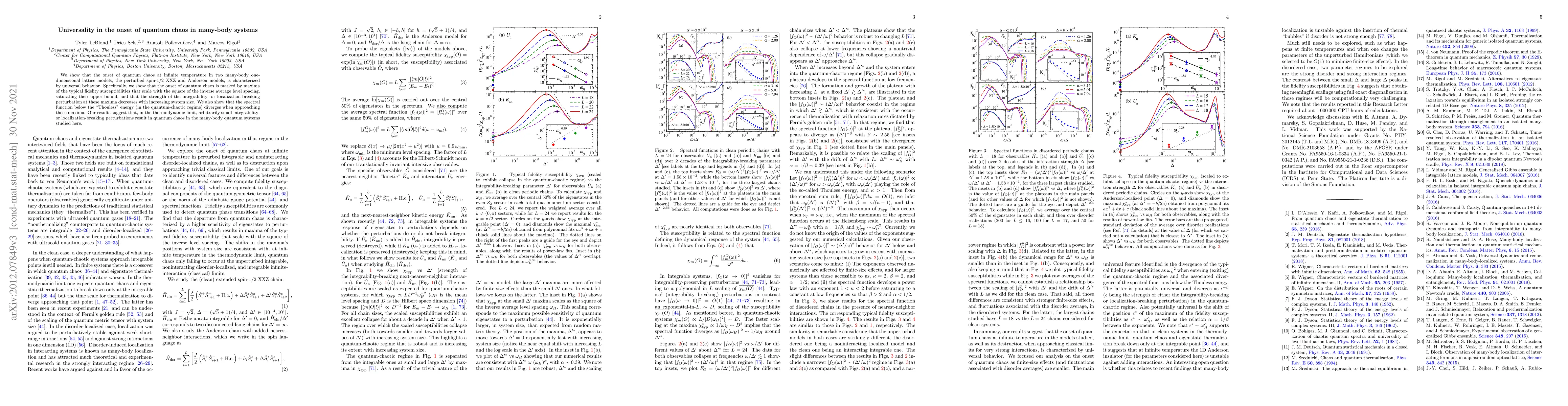 This work is significant as it uncovers universal behavior in the onset of quantum chaos in many-body systems, providing insights into the transition from integrable to chaotic behavior, which is crucial for understanding thermalization in quantum systems.