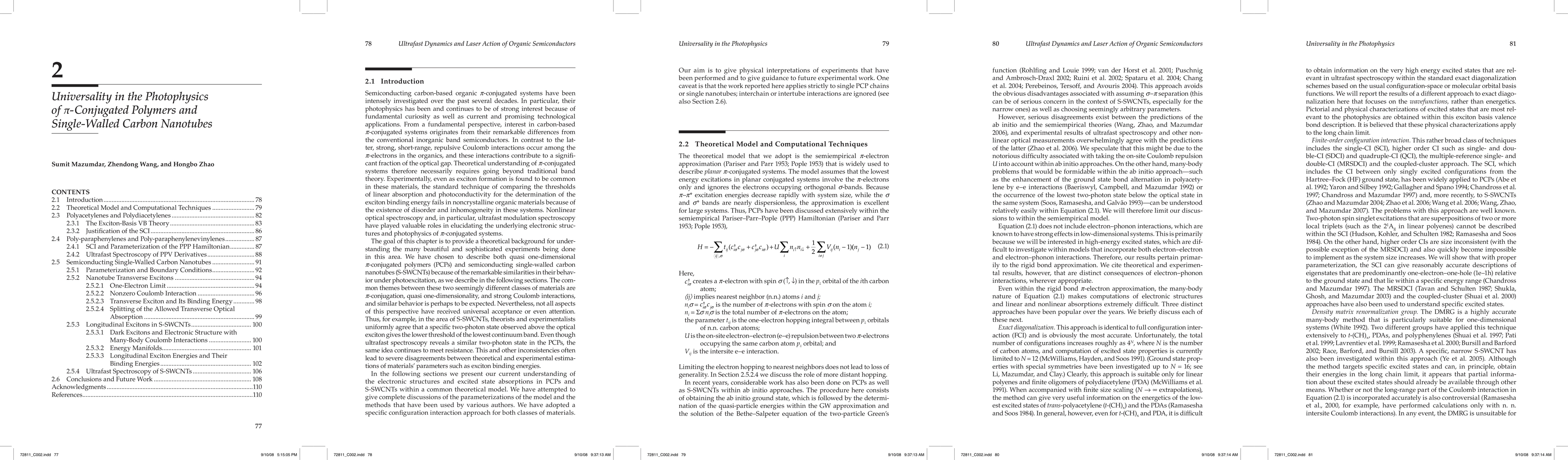This paper explores the photophysical similarities between pi-conjugated polymers and semiconducting single-walled carbon nanotubes, emphasizing their shared pi-conjugation, quasi one-dimensionality, and strong Coulomb interactions. It provides a unified theoretical framework to interpret their electronic structures and excited state absorptions, aiming to guide future experimental research.
