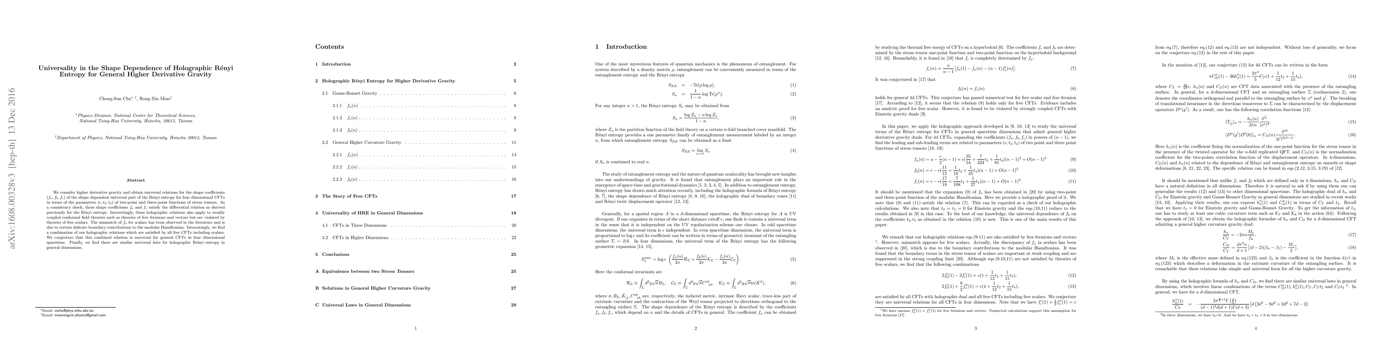This paper explores universal relations for shape coefficients in the holographic R\'enyi entropy of higher derivative gravity, showing they apply to weakly coupled CFTs like free fermions and vectors but not to free scalars due to boundary contributions. A combined relation is proposed that holds for all free CFTs, suggesting universality for general CFTs in four dimensions.