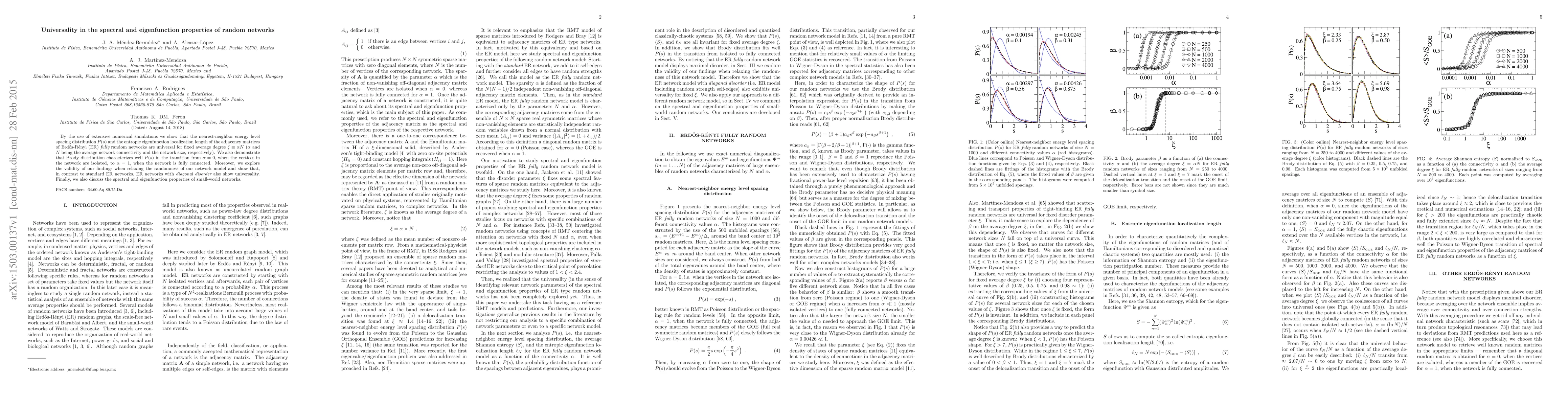 By the use of extensive numerical simulations we show that the nearest-neighbor energy level spacing distribution $P(s)$ and the entropic eigenfunction localization length of the adjacency matrices of Erd\H{o}s-R\'enyi (ER) {\it fully} random networks are universal for fixed average degree $\xi\equiv \alpha N$ ($\alpha$ and $N$ being the average network connectivity and the network size, respectively). We also demonstrate that Brody distribution characterizes well $P(s)$ in the transition from $\alpha=0$, when the vertices in the network are isolated, to $\alpha=1$, when the network is fully connected. Moreover, we explore the validity of our findings when relaxing the randomness of our network model and show that, in contrast to standard ER networks, ER networks with {\it diagonal disorder} also show universality. Finally, we also discuss the spectral and eigenfunction properties of small-world networks.