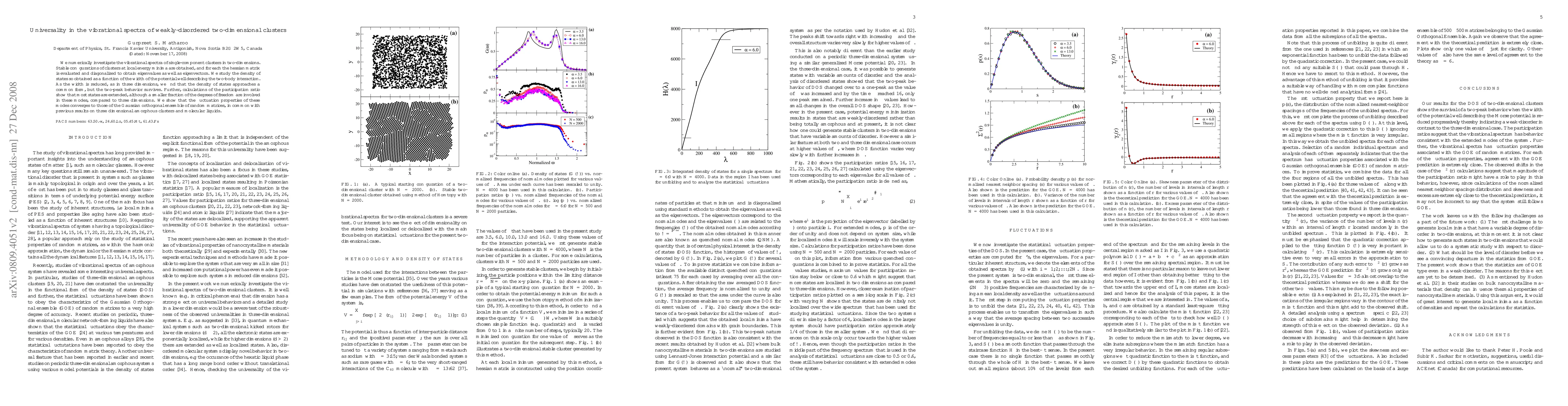 We numerically investigate the vibrational spectra of single-component clusters in two-dimensions. Stable configurations of clusters at local energy minima are obtained, and for each the hessian matrix is evaluated and diagonalized to obtain eigenvalues as well as eigenvectors. We study the density of states so obtained as a function of the width of the potential well describing the two-body interaction. As the width is reduced, as in three dimensions, we find that the density of states approaches a common form, but the two-peak behavior survives. Further, calculations of the participation ratio show that most states are extended, although a smaller fraction of the degrees of freedom are involved in these modes, compared to three dimensions. We show that the fluctuation properties of these modes converges to those of the Gaussian orthogonal ensemble of random matrices, in common with previous results on three dimensional amorphous clusters and molecular liquids