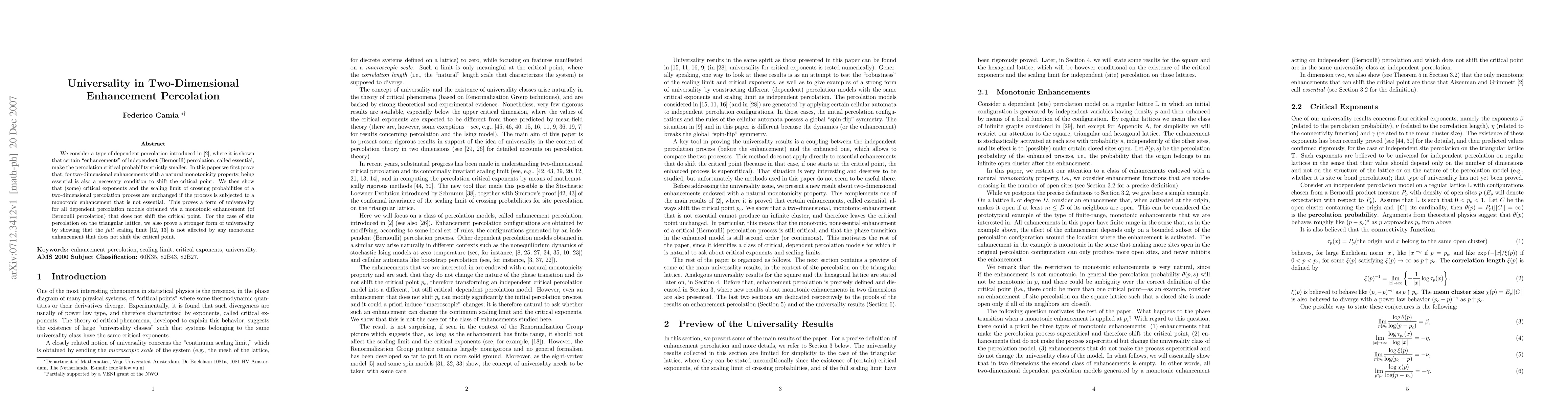 This paper proves that in two-dimensional enhancement percolation, certain non-essential enhancements do not shift the critical probability, maintaining the same critical exponents and scaling limits. For site percolation on the triangular lattice, it further demonstrates that any non-essential enhancement does not alter the full scaling limit.