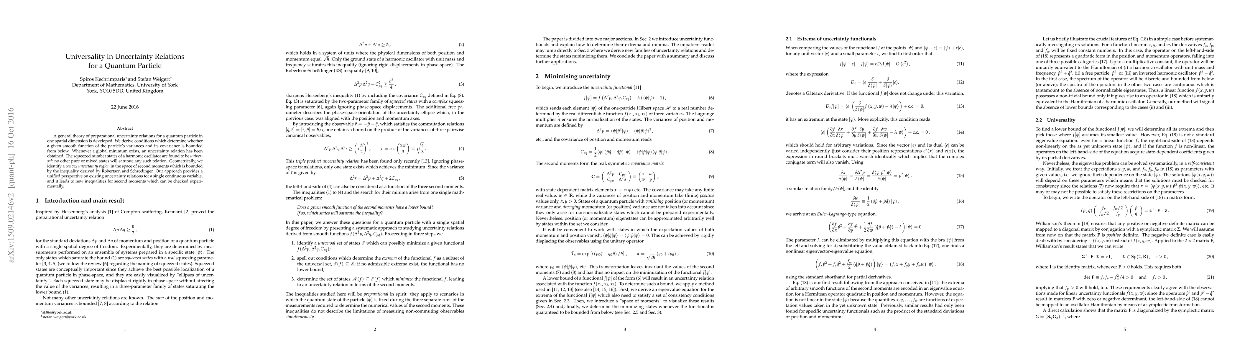 A general theory of preparational uncertainty relations for a quantum particle in one spatial dimension is developed. We derive conditions which determine whether a given smooth function of the particle's variances and its covariance is bounded from below. Whenever a global minimum exists, an uncertainty relation has been obtained. The squeezed number states of a harmonic oscillator are found to be universal: no other pure or mixed states will saturate any such relation. Geometrically, we identify a convex uncertainty region in the space of second moments which is bounded by the inequality derived by Robertson and Schr\"{o}dinger. Our approach not only unifies existing uncertainty relations but also leads to new inequalities for second moments.