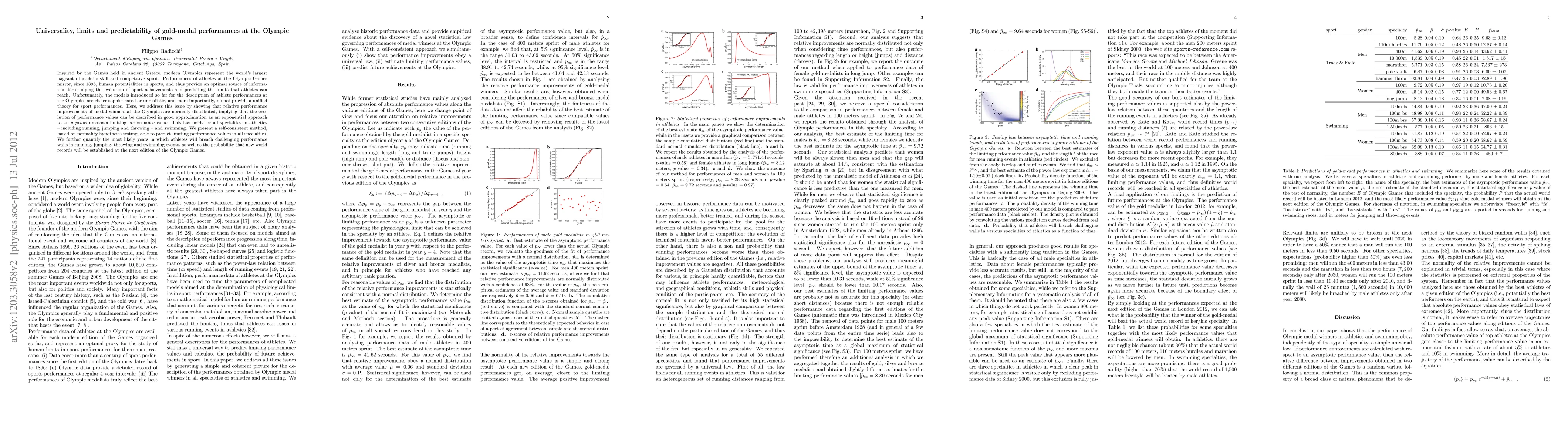 Inspired by the Games held in ancient Greece, modern Olympics represent the world's largest pageant of athletic skill and competitive spirit. Performances of athletes at the Olympic Games mirror, since 1896, human potentialities in sports, and thus provide an optimal source of information for studying the evolution of sport achievements and predicting the limits that athletes can reach. Unfortunately, the models introduced so far for the description of athlete performances at the Olympics are either sophisticated or unrealistic, and more importantly, do not provide a unified theory for sport performances. Here, we address this issue by showing that relative performance improvements of medal winners at the Olympics are normally distributed, implying that the evolution of performance values can be described in good approximation as an exponential approach to an a priori unknown limiting performance value. This law holds for all specialties in athletics-including running, jumping, and throwing-and swimming. We present a self-consistent method, based on normality hypothesis testing, able to predict limiting performance values in all specialties. We further quantify the most likely years in which athletes will breach challenging performance walls in running, jumping, throwing, and swimming events, as well as the probability that new world records will be established at the next edition of the Olympic Games.