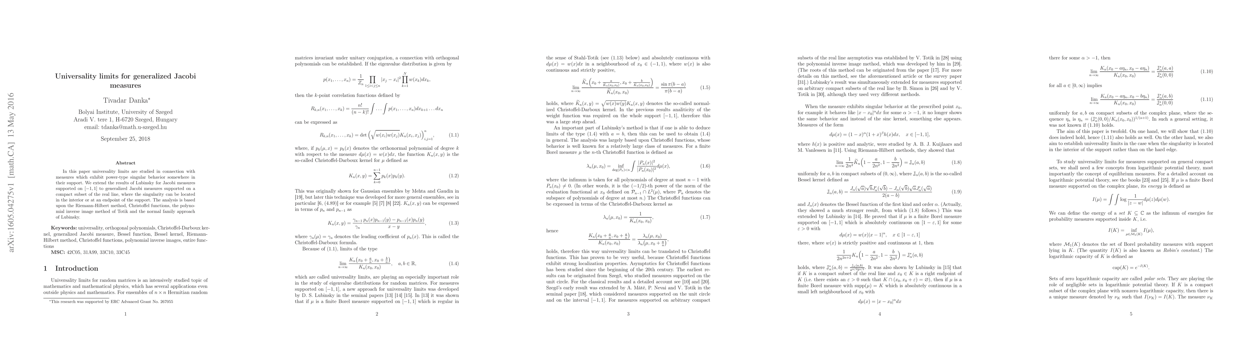 This paper investigates universality limits for generalized Jacobi measures with power-type singular behavior on a compact subset of the real line, extending previous results to include both interior and endpoint singularities.