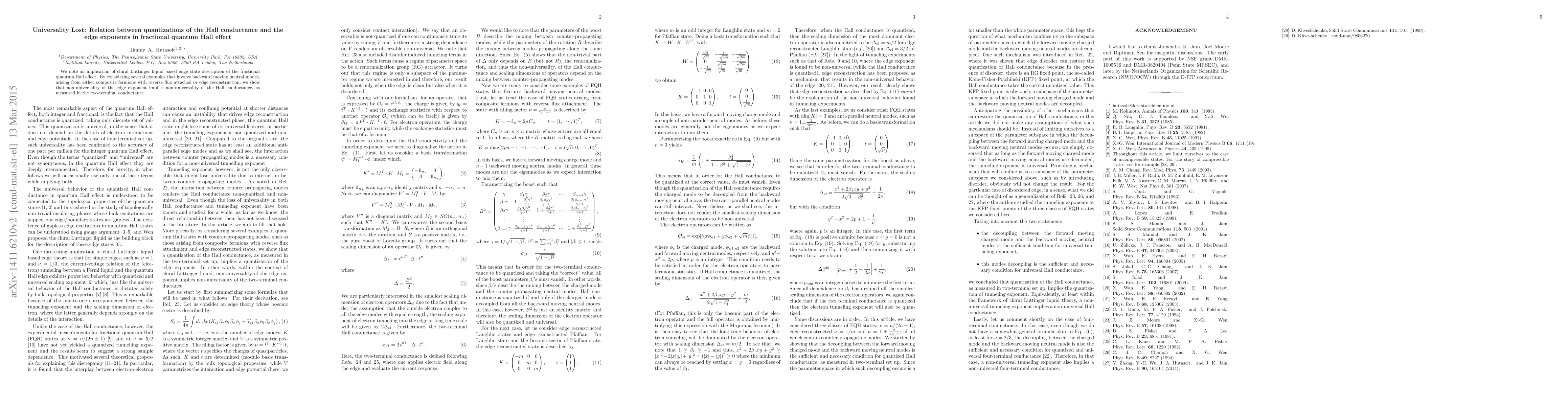 We note an implication of chiral Luttinger liquid based edge state description of the fractional quantum Hall effect. By considering several examples that involve backward moving neutral modes, arising from either composite fermions with reverse flux attached or edge reconstruction, we show that non-universality of the edge exponent implies non-universality of the Hall conductance, as measured in the two-terminal conductance.