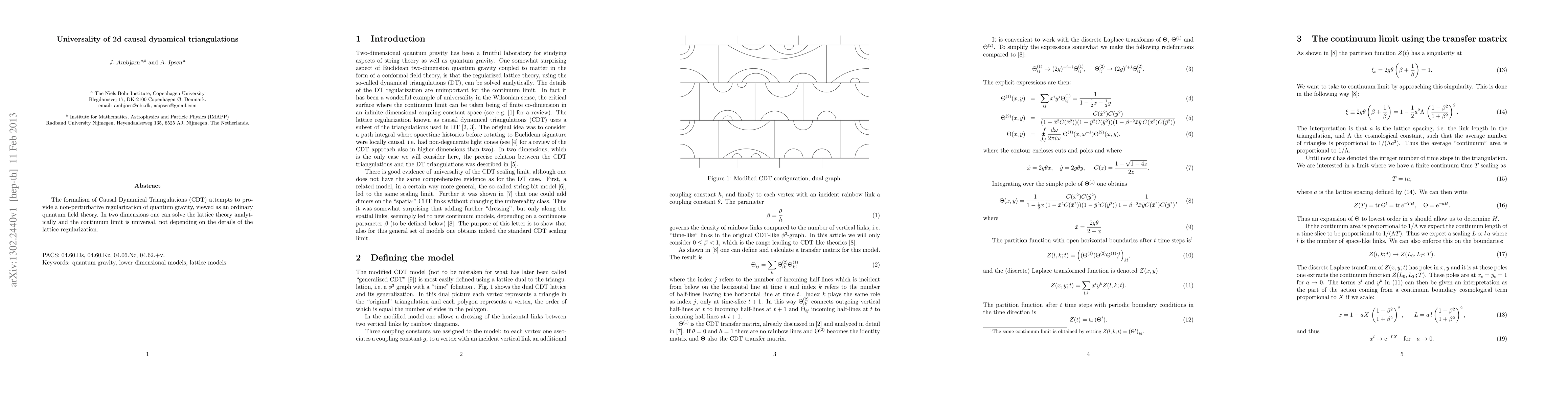 This paper explores the universality of 2D Causal Dynamical Triangulations (CDT), demonstrating that the lattice theory can be solved analytically and that the continuum limit is independent of specific lattice regularization details, providing a non-perturbative approach to quantum gravity.