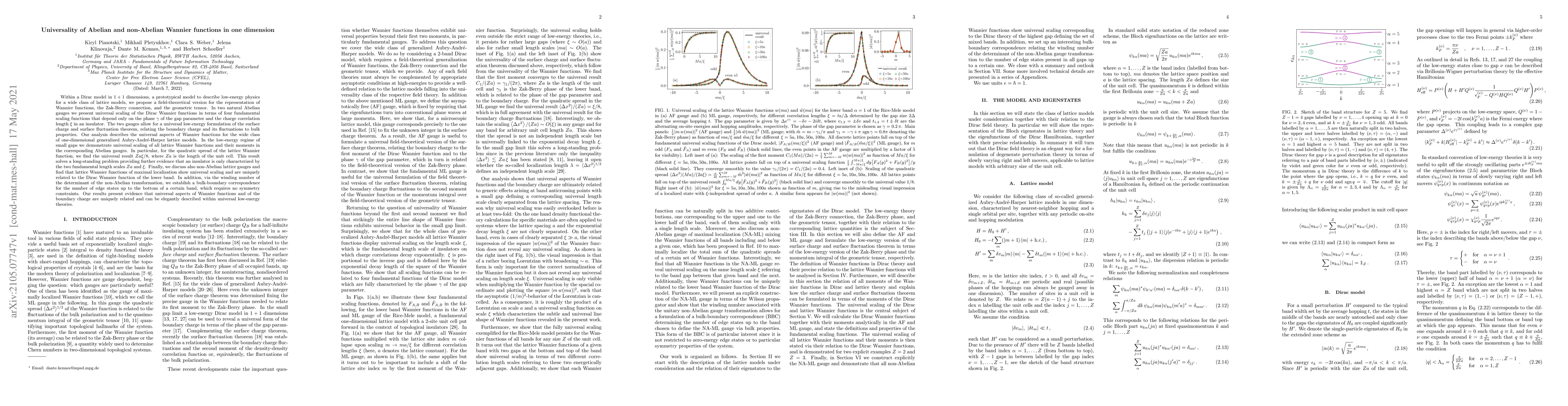 Researchers propose a field-theoretical model for Wannier functions in 1D Dirac systems, finding universal scaling of Abelian and non-Abelian models in terms of fundamental scaling functions, with implications for understanding surface charge and fluctuations.