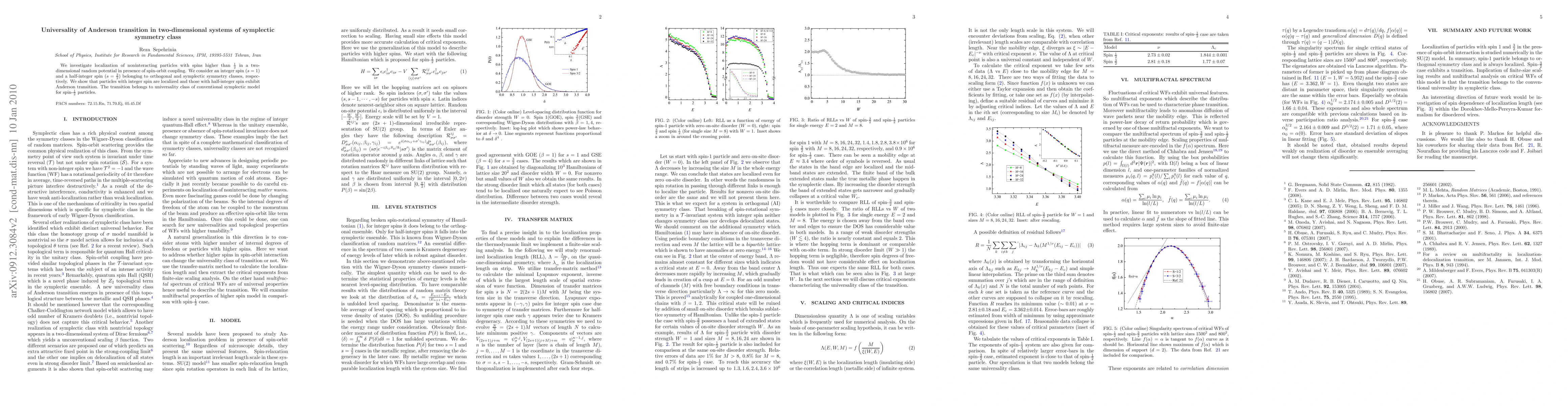 We investigate localization of noninteracting particles with spins higher than 1/2 in a two-dimensional random potential in presence of spin-orbit coupling. We consider an integer spin ($s=1$) and a half-integer spin ($s=3/2$) belonging to orthogonal and symplectic symmetry classes, respectively. We show that particles with integer spin are localized and those with half-integer spin exhibit Anderson transition. The transition belongs to universality class of conventional symplectic model for spin-1/2 particles.