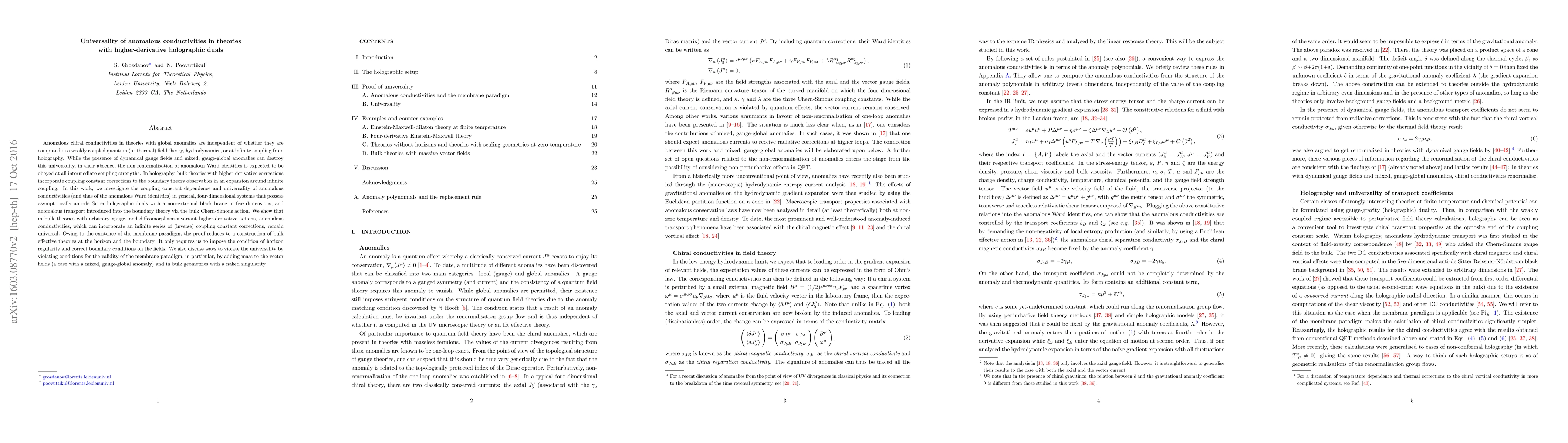 This paper investigates the universality of anomalous chiral conductivities in four-dimensional systems with higher-derivative holographic duals, demonstrating that these conductivities remain universal across different coupling regimes, provided the membrane paradigm holds. It also explores scenarios where universality can be violated, such as by introducing mass to vector fields or using bulk geometries with naked singularities.