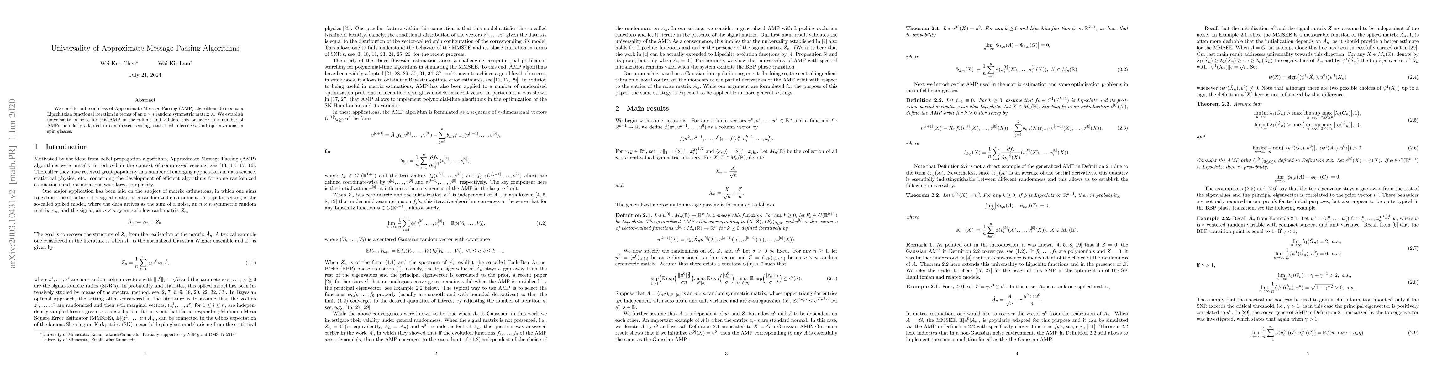 This paper establishes the universality of Approximate Message Passing (AMP) algorithms in the large $n$ limit, demonstrating consistent behavior across various AMP applications in compressed sensing, statistical inference, and spin glass optimizations. The study validates this behavior through theoretical analysis and practical examples.