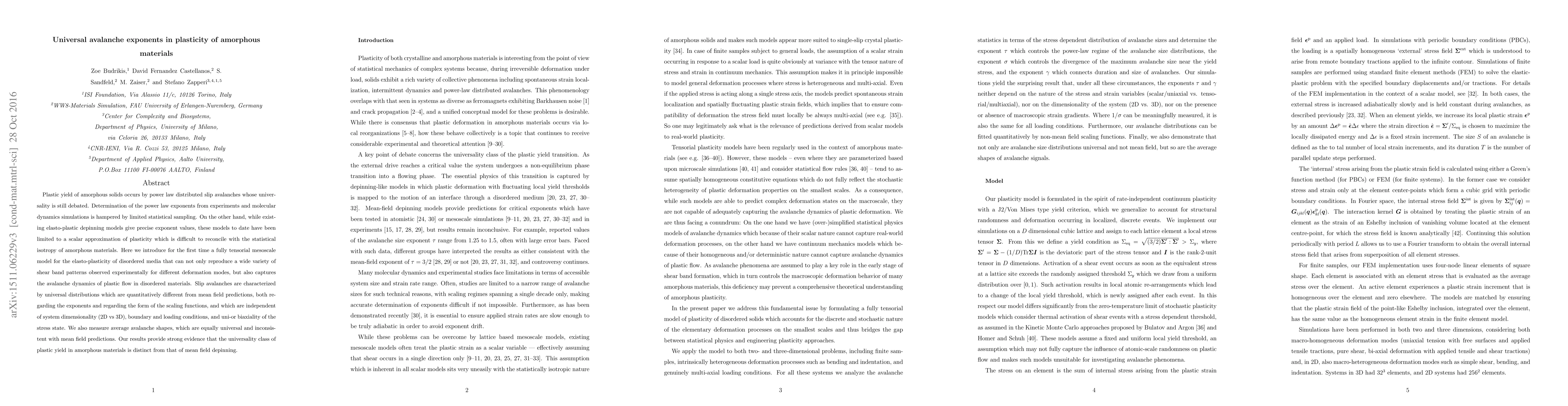 This paper introduces a tensorial mesoscale model for elasto-plasticity in disordered solids, demonstrating that plastic deformation avalanches exhibit universal distributions independent of system dimensions and loading conditions. The model reveals a distinct universality class for plastic yield in amorphous materials, differing from mean field predictions.