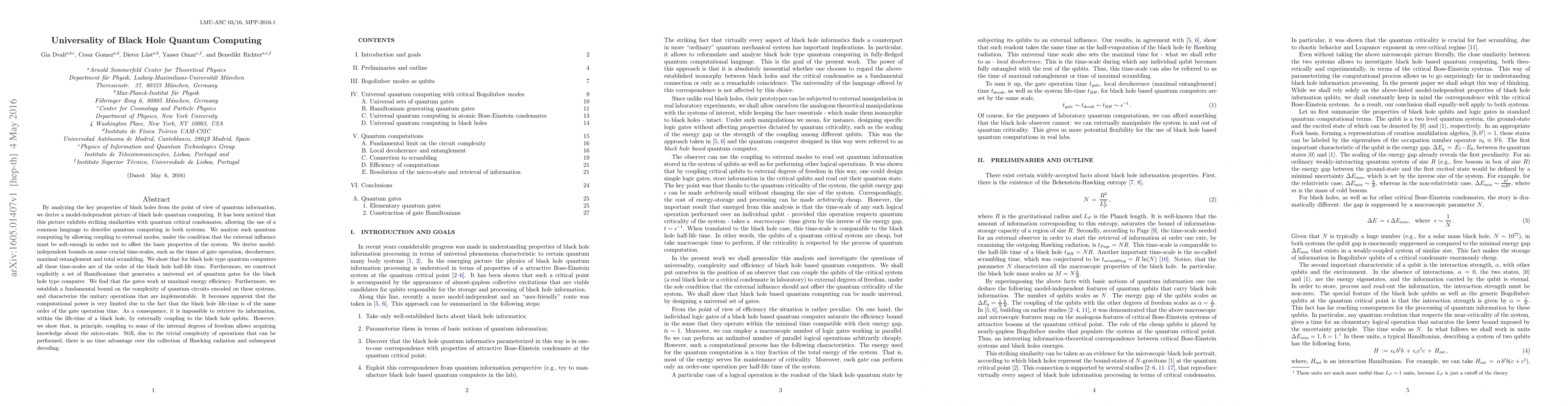 By analyzing the key properties of black holes from the point of view of quantum information, we derive a model-independent picture of black hole quantum computing. It has been noticed that this picture exhibits striking similarities with quantum critical condensates, allowing the use of a common language to describe quantum computing in both systems. We analyze such quantum computing by allowing coupling to external modes, under the condition that the external influence must be soft-enough in order not to offset the basic properties of the system. We derive model-independent bounds on some crucial time-scales, such as the times of gate operation, decoherence, maximal entanglement and total scrambling. We show that for black hole type quantum computers all these time-scales are of the order of the black hole half-life time. Furthermore, we construct explicitly a set of Hamiltonians that generates a universal set of quantum gates for the black hole type computer. We find that the gates work at maximal energy efficiency. Furthermore, we establish a fundamental bound on the complexity of quantum circuits encoded on these systems, and characterize the unitary operations that are implementable. It becomes apparent that the computational power is very limited due to the fact that the black hole life-time is of the same order of the gate operation time. As a consequence, it is impossible to retrieve its information, within the life-time of a black hole, by externally coupling to the black hole qubits. However, we show that, in principle, coupling to some of the internal degrees of freedom allows acquiring knowledge about the micro-state. Still, due to the trivial complexity of operations that can be performed, there is no time advantage over the collection of Hawking radiation and subsequent decoding.