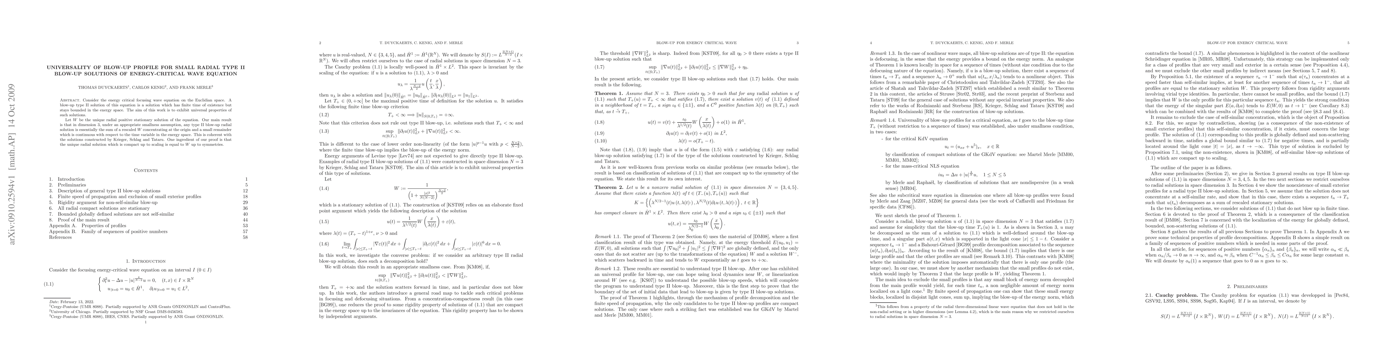 This paper investigates the universality of blow-up profiles for small radial type II blow-up solutions of the energy-critical wave equation in three dimensions. It demonstrates that under a smallness condition, any such blow-up solution is essentially the sum of a rescaled unique radial solution concentrating at the origin and a small continuous remainder.