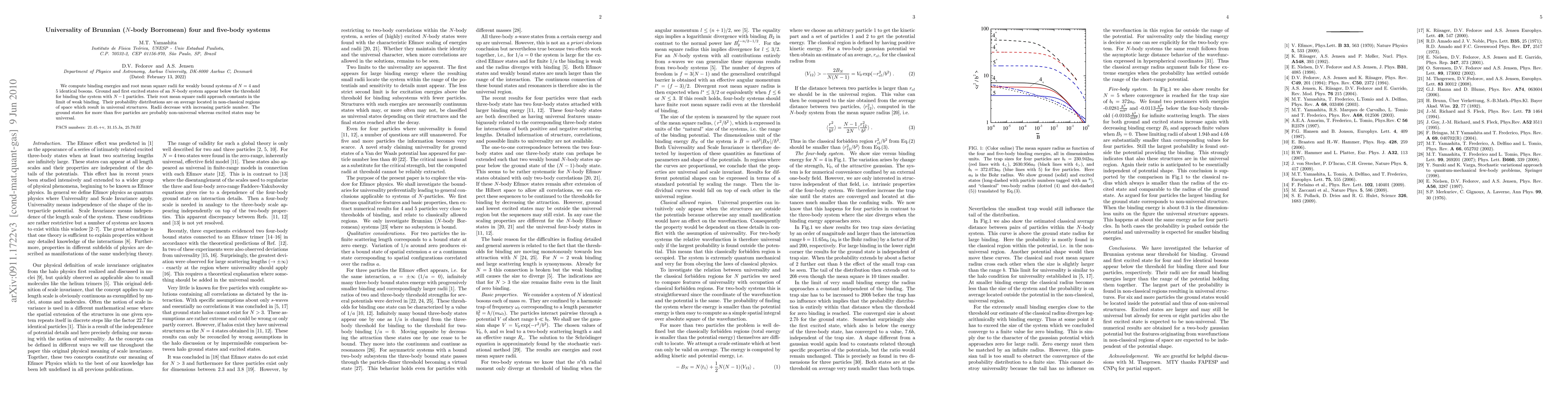 We compute binding energies and root mean square radii for weakly bound systems of $N=4$ and $5$ identical bosons. Ground and first excited states of an $N$-body system appear below the threshold for binding the system with $N-1$ particles. Their root mean square radii approach constants in the limit of weak binding. Their probability distributions are on average located in non-classical regions of space which result in universal structures. Radii decrease with increasing particle number. The ground states for more than five particles are probably non-universal whereas excited states may be universal.