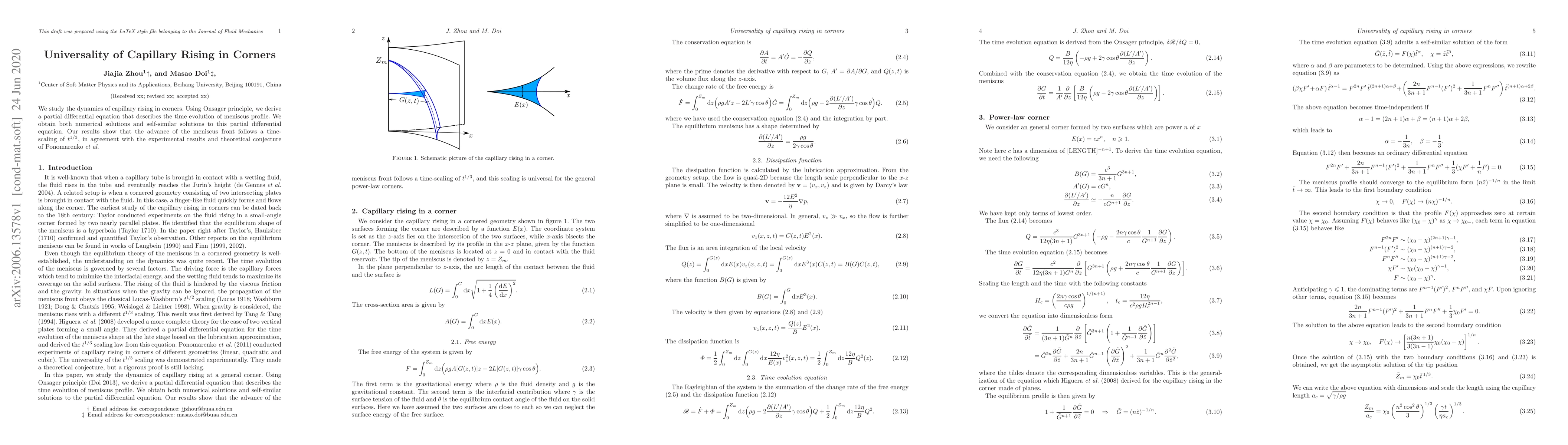 This paper investigates the dynamics of capillary rise in corners, deriving a partial differential equation using the Onsager principle. It finds that the meniscus front advances with a time-scaling of $t^{1/3}$, consistent with experimental observations and theoretical predictions.